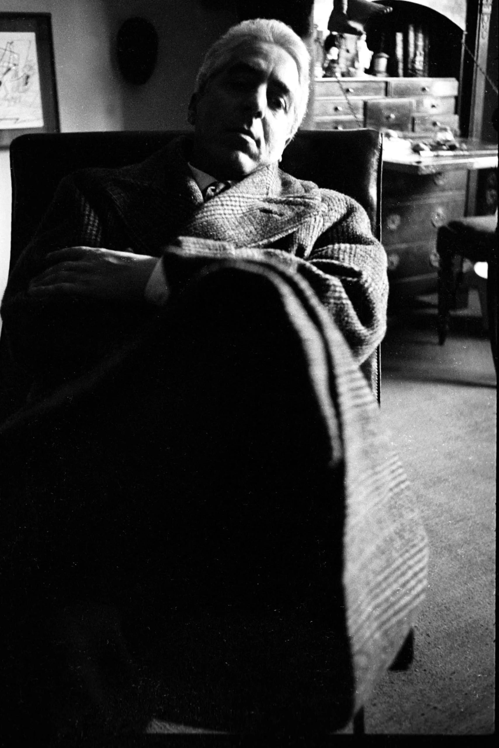 High-contrast black and white photograph, white man with gray hair reclines in a dark armchair, low camera angle, dramatic directional lighting