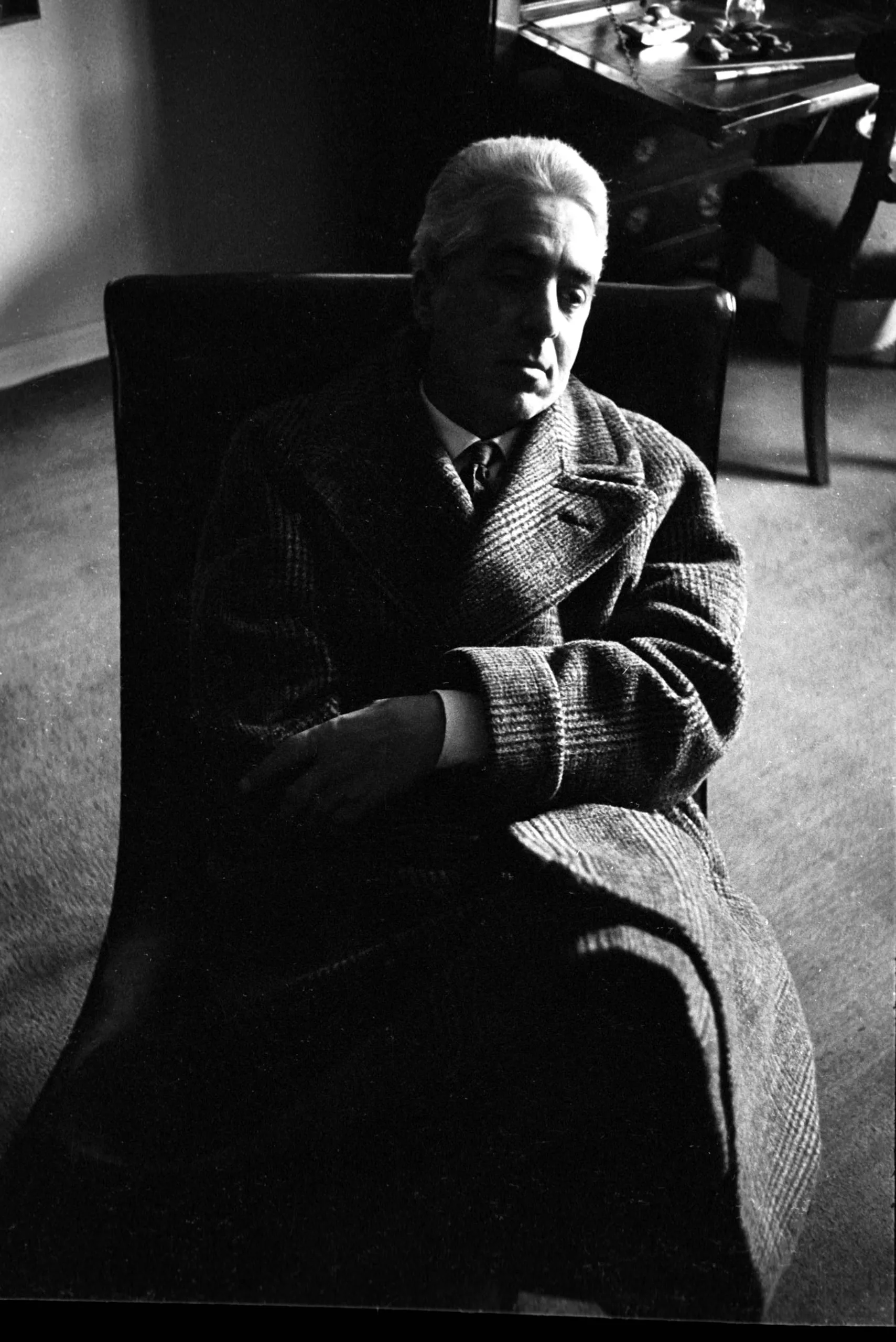 Black and white portrait photograph of a white man in a tweed overcoat seated in a low chair, arms folded, head tilted down, lit with strong directional light from the left