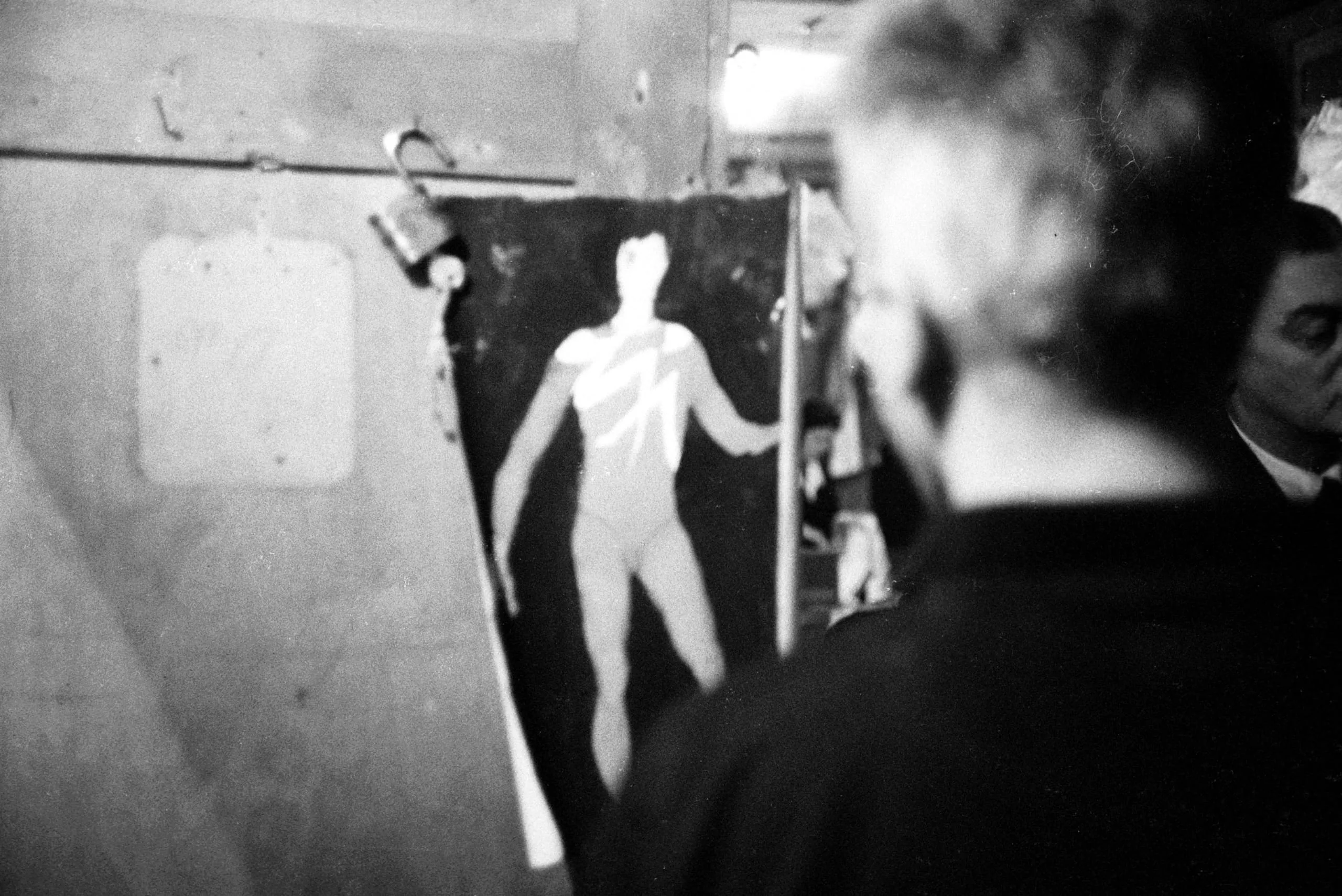 Black and white photograph of a glowing white projected or painted nude figure on a dark panel, viewed from behind a blurred figure in the foreground