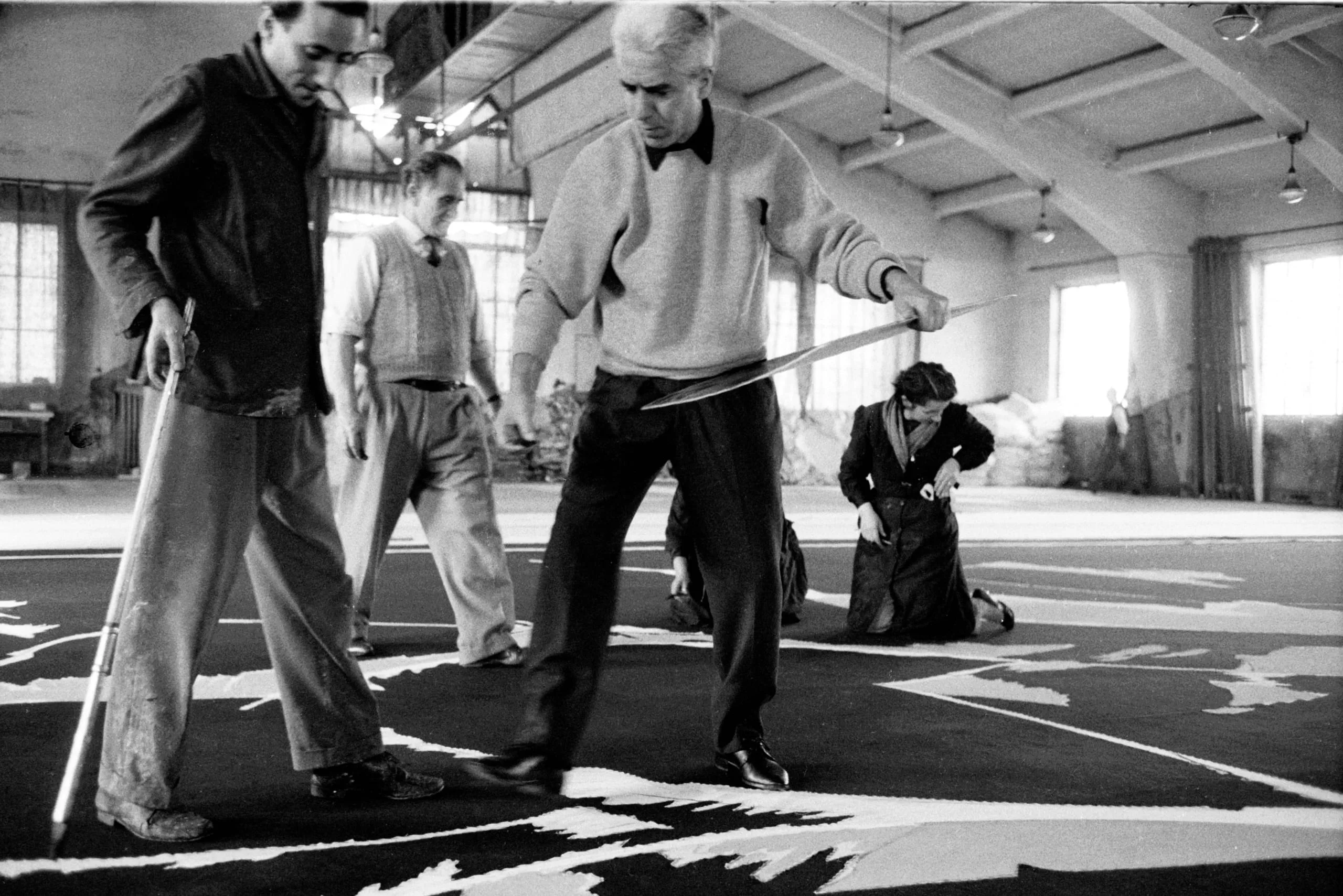 Black and white photograph of four people working on a large dark canvas spread across the floor of an industrial studio, one figure sweeping a long strip across the surface