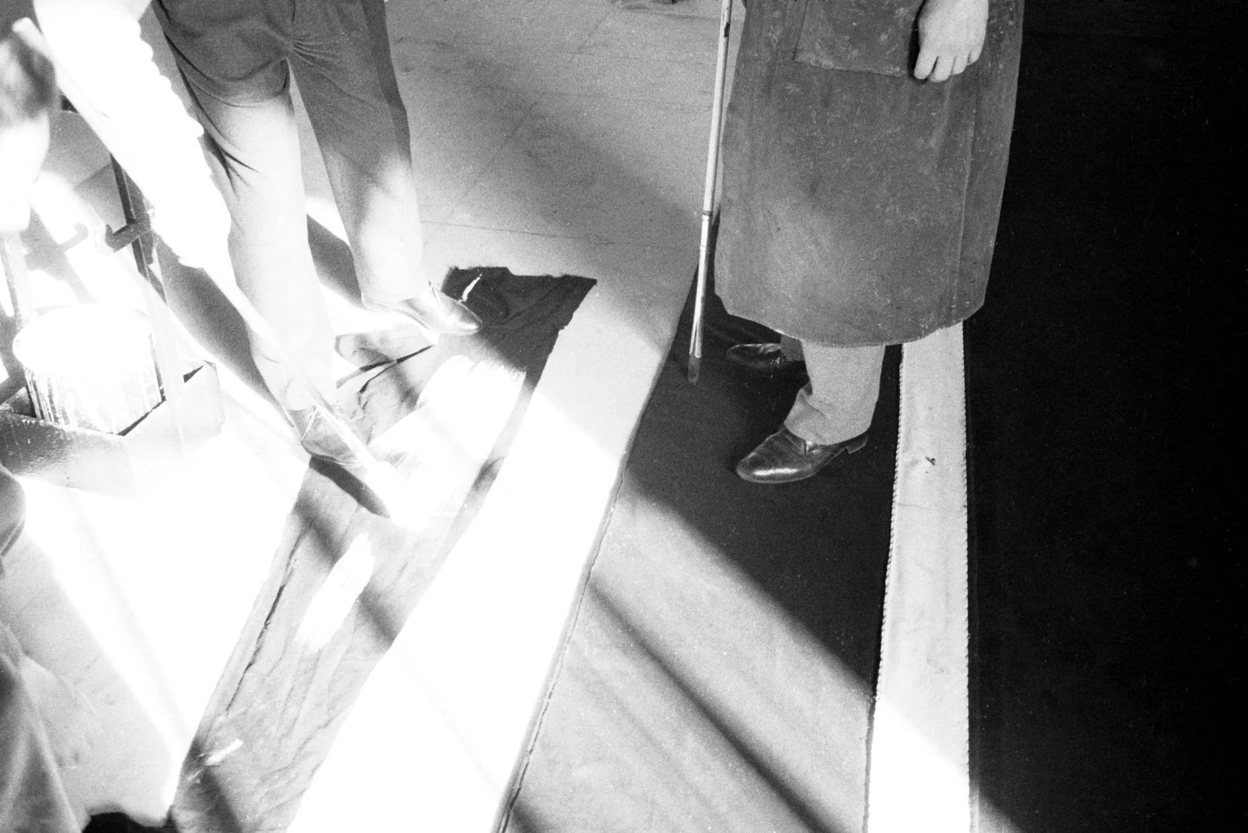 Black and white photograph angled sharply downward showing two figures from the waist down, harsh diagonal light flooding the floor with deep surrounding shadows