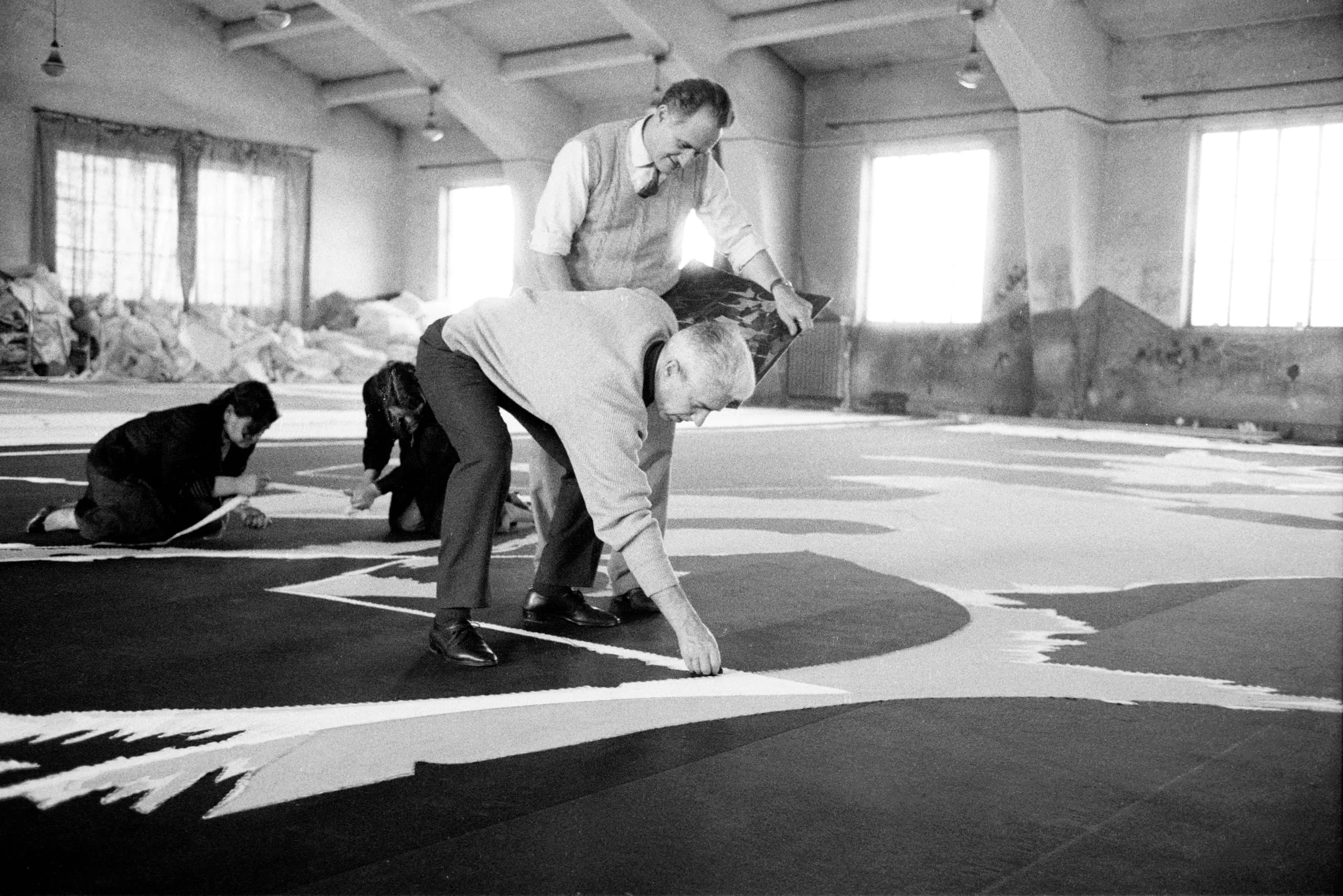 Black and white photograph of four people working on a large-scale black and white floor composition inside a bare industrial room with high windows