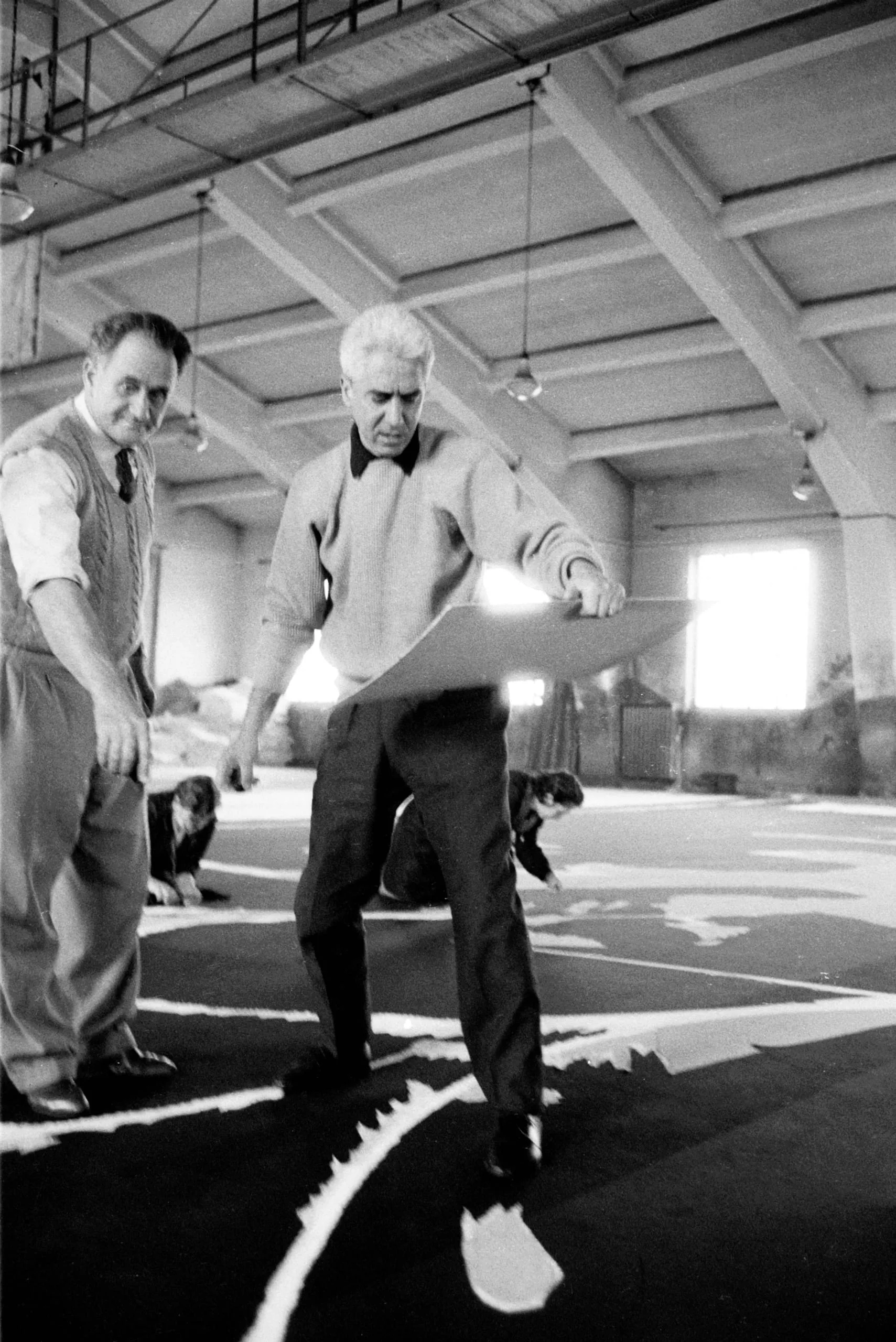 Black and white photograph of two men bending over a large dark canvas spread on the floor of a warehouse-like space