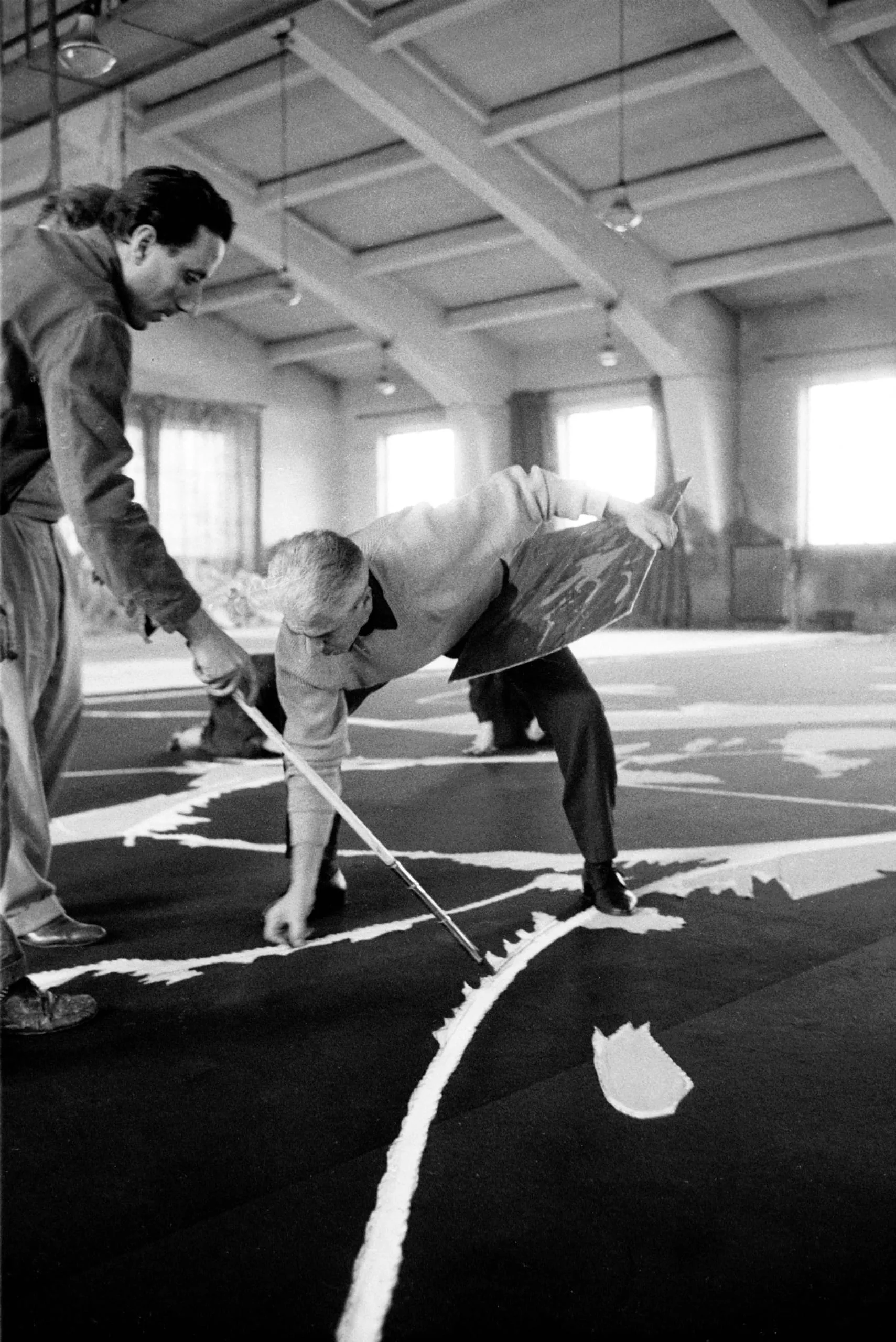 Black and white photograph of two men in a large industrial room, one bending to drag a long stick across a dark floor marked with white painted lines