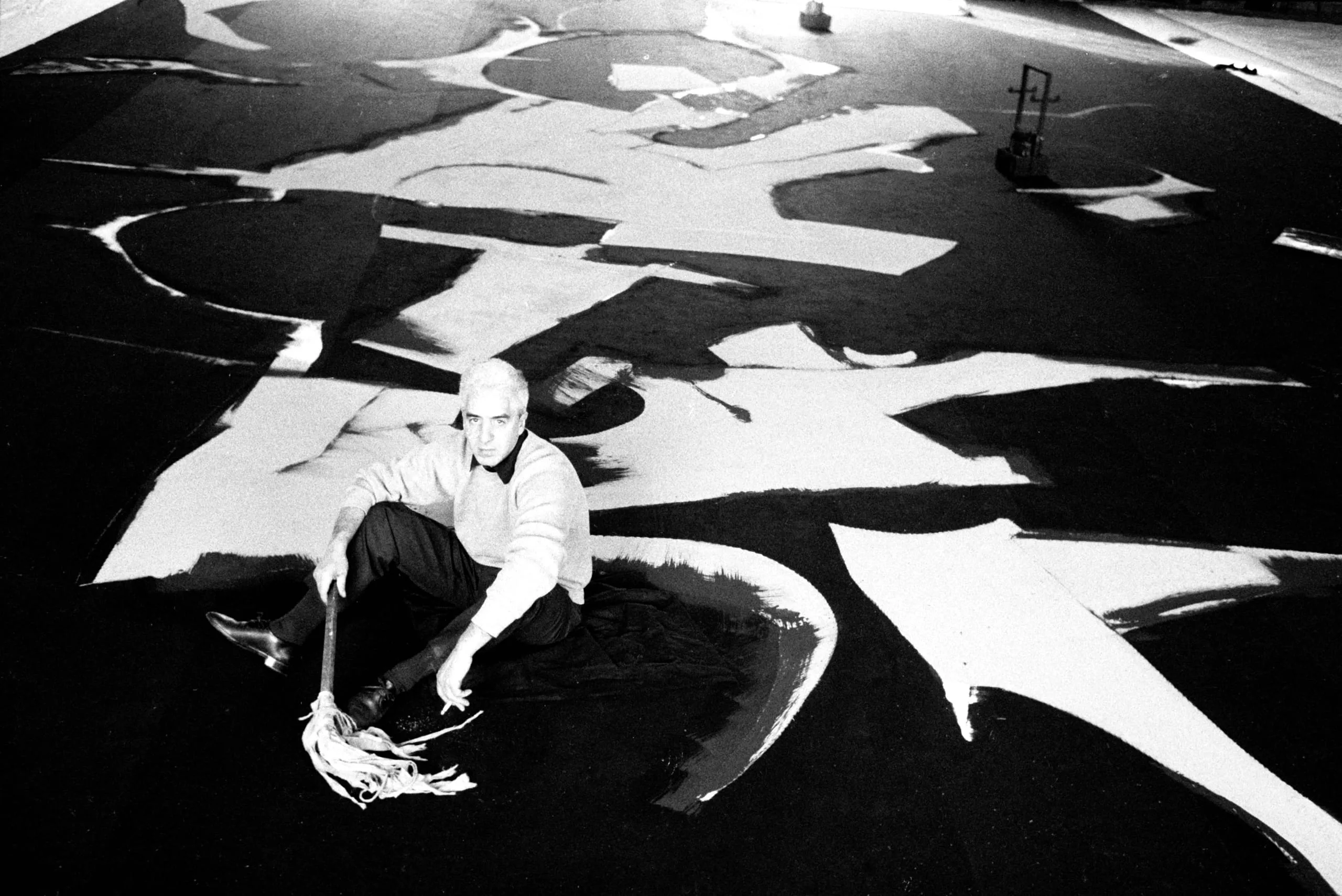 Black and white photograph shot from above, a man crouching on a large floor canvas, holding a wide brush amid sweeping black and white painted strokes