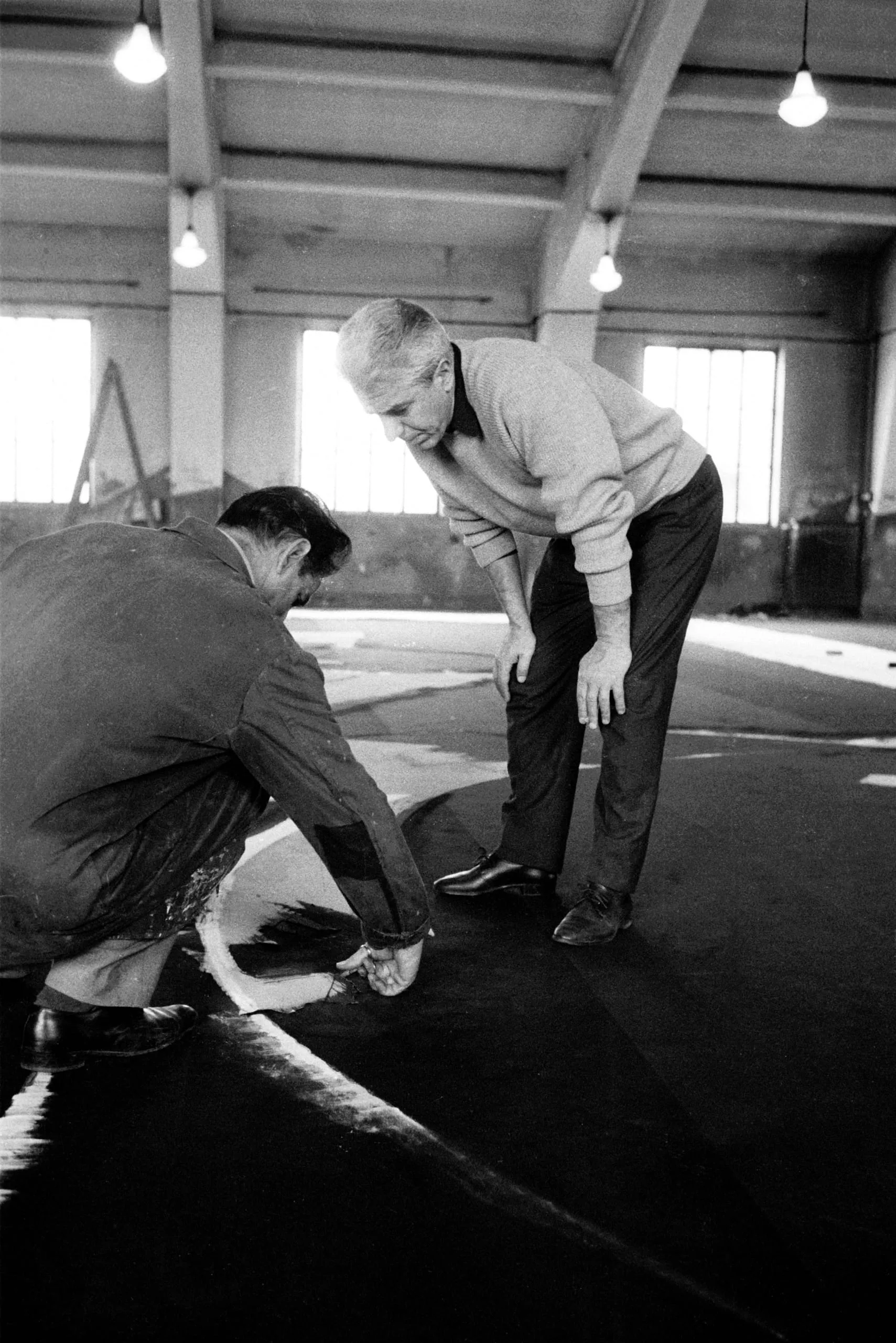 Black and white photograph of two men in a large industrial space, one crouching and one bent over, both examining a mark or line on a dark floor