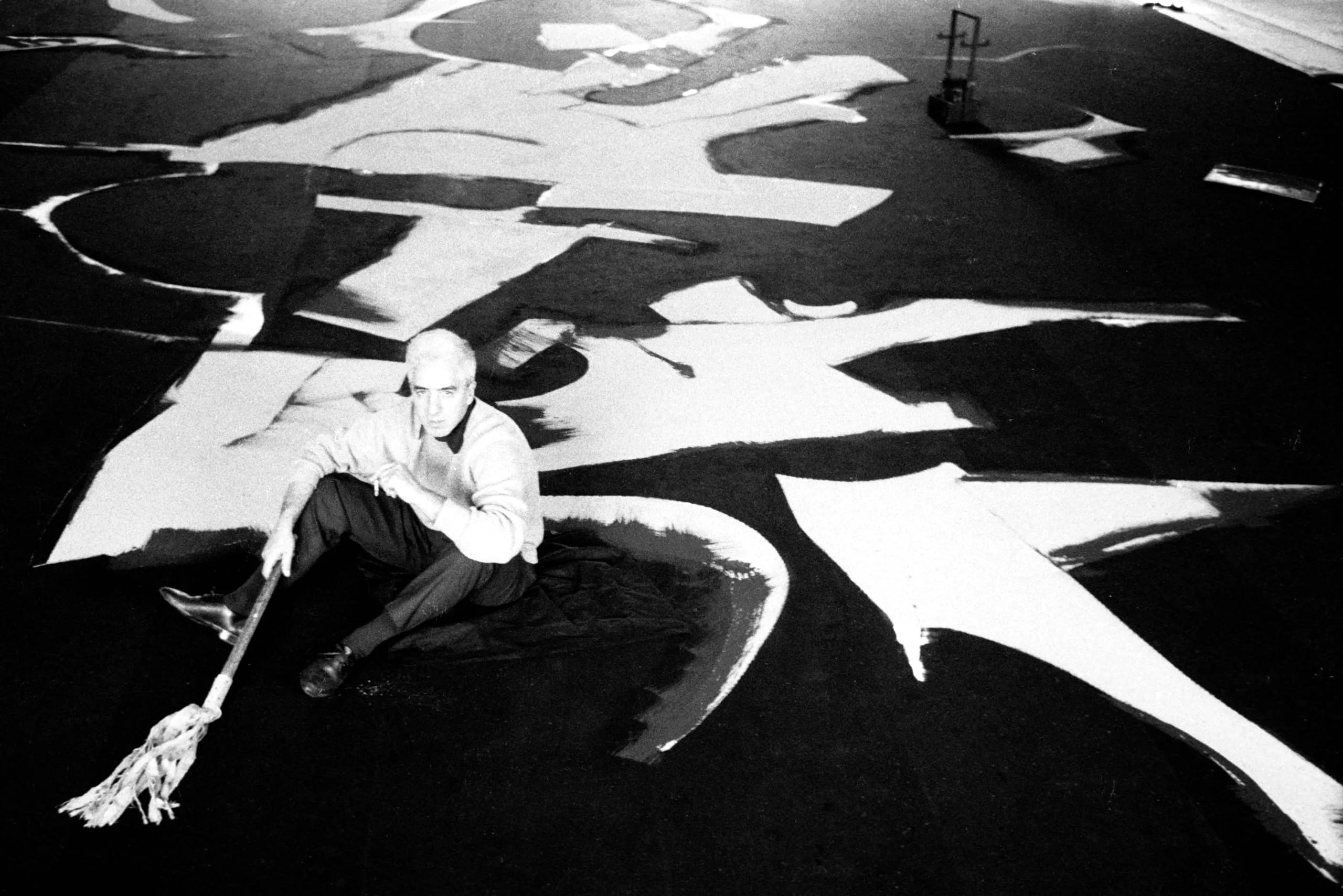 Black and white photograph of a bald man sitting on a dark floor amid large-scale abstract white brushstrokes, holding a wide mop or brush