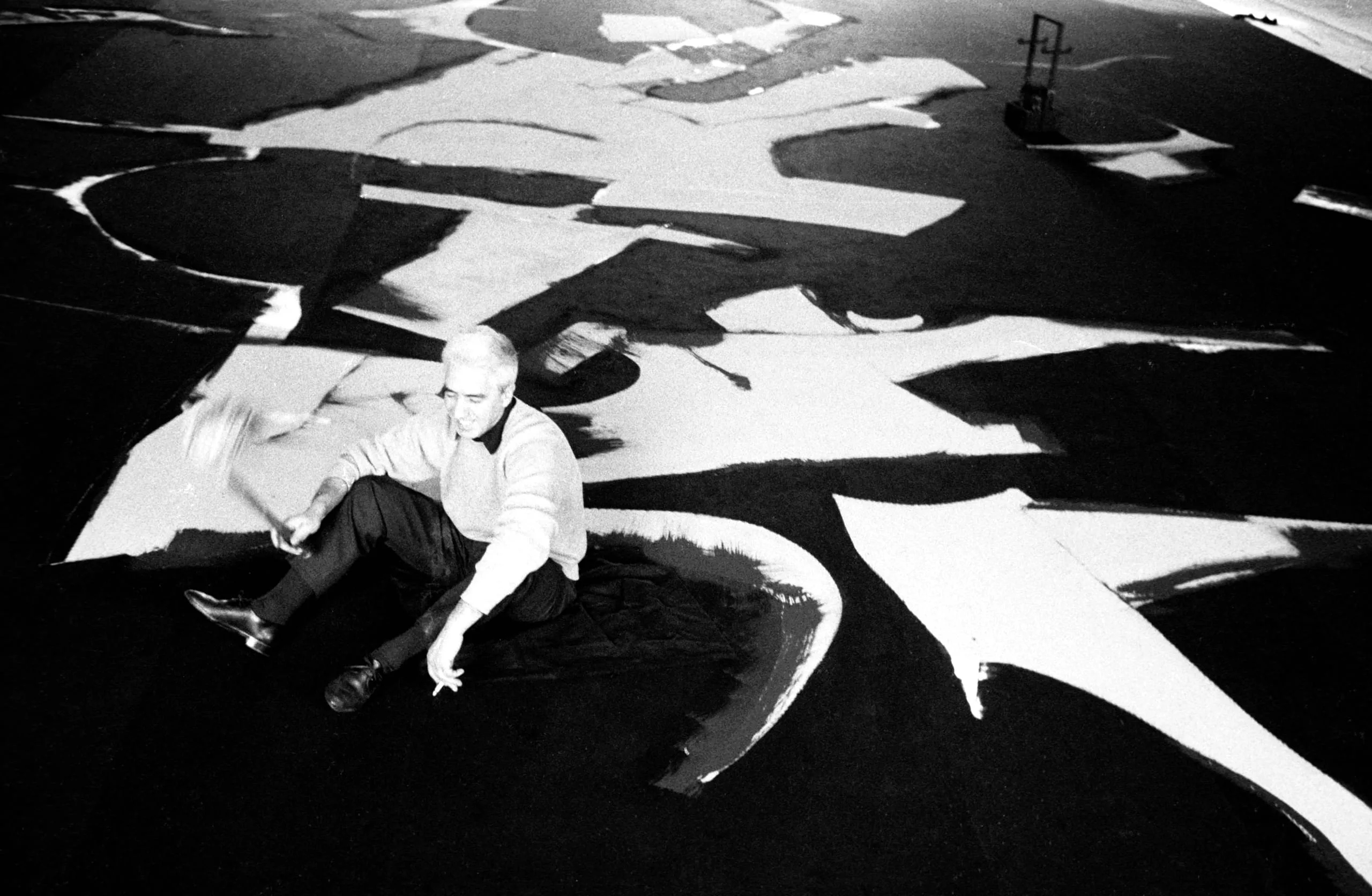 Black and white photograph shot from above, a man in a light sweater seated on a dark floor covered with large, sweeping white painted brushstrokes