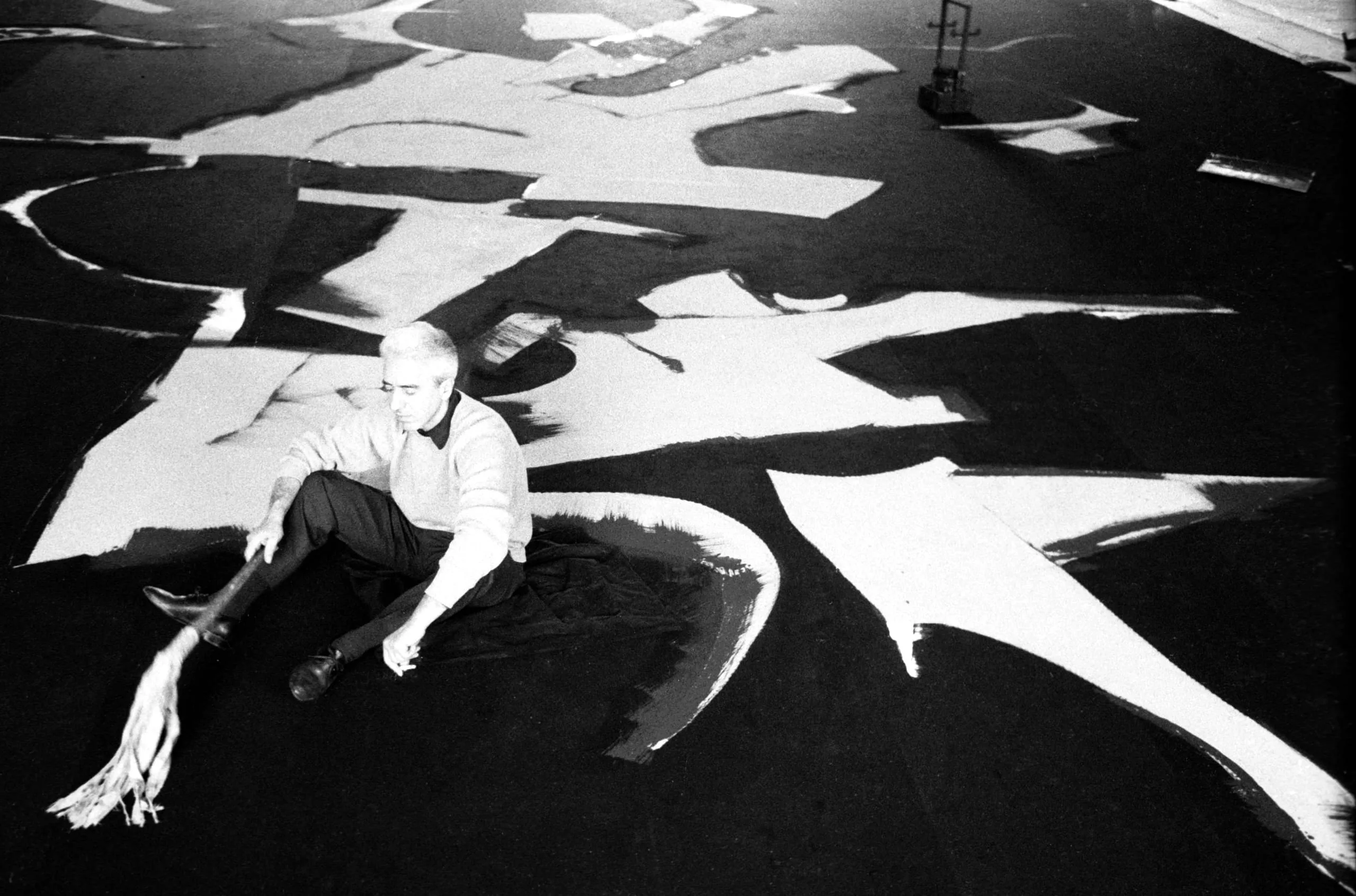 Black and white photograph shot from above, a pale-haired person in a light sweater sits on a dark floor covered in large gestural white painted brushstrokes