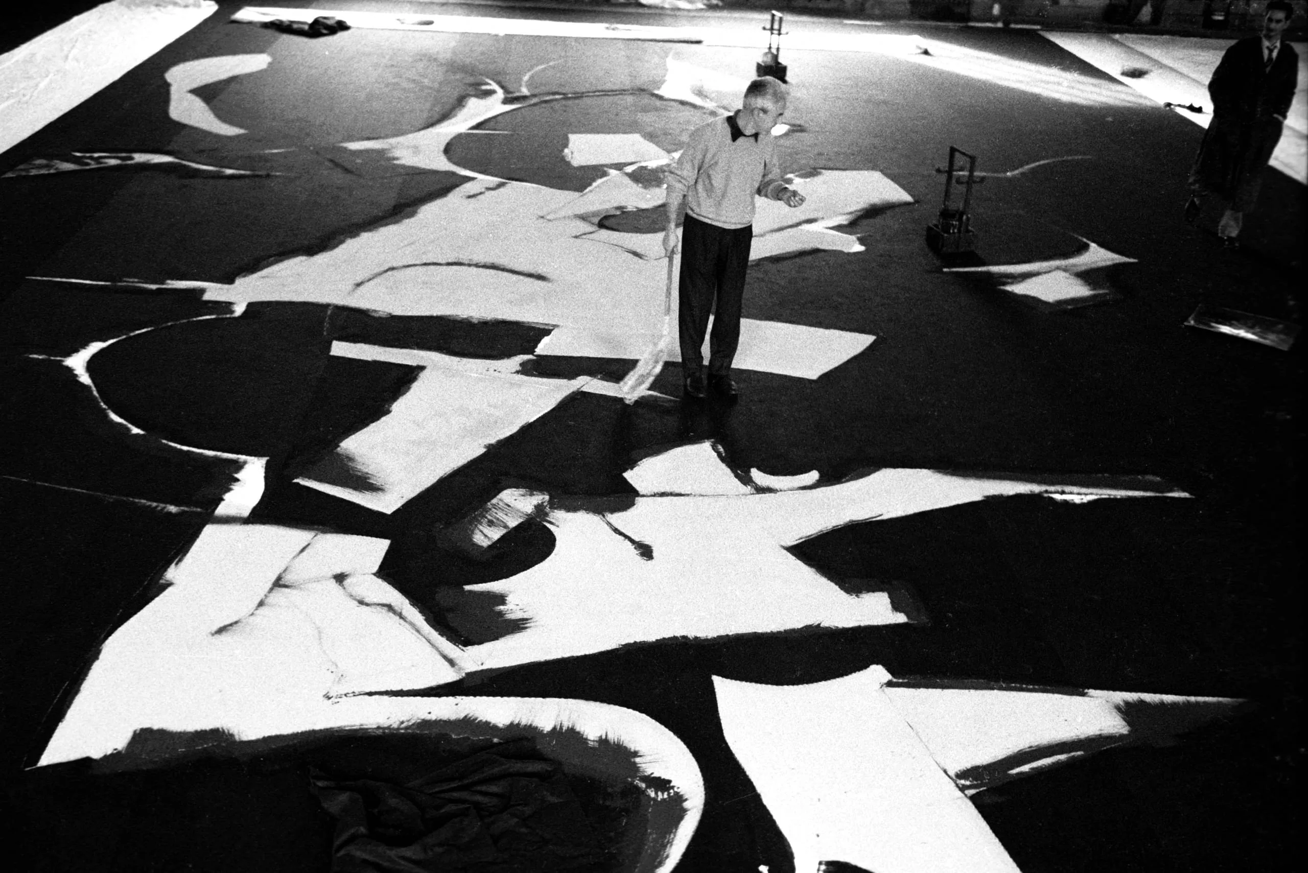 Black and white photograph, high-angle view of a man standing on a large-scale abstract painting on the floor, holding a long-handled brush, surrounded by white brushstrokes and torn paper shapes on a dark ground
