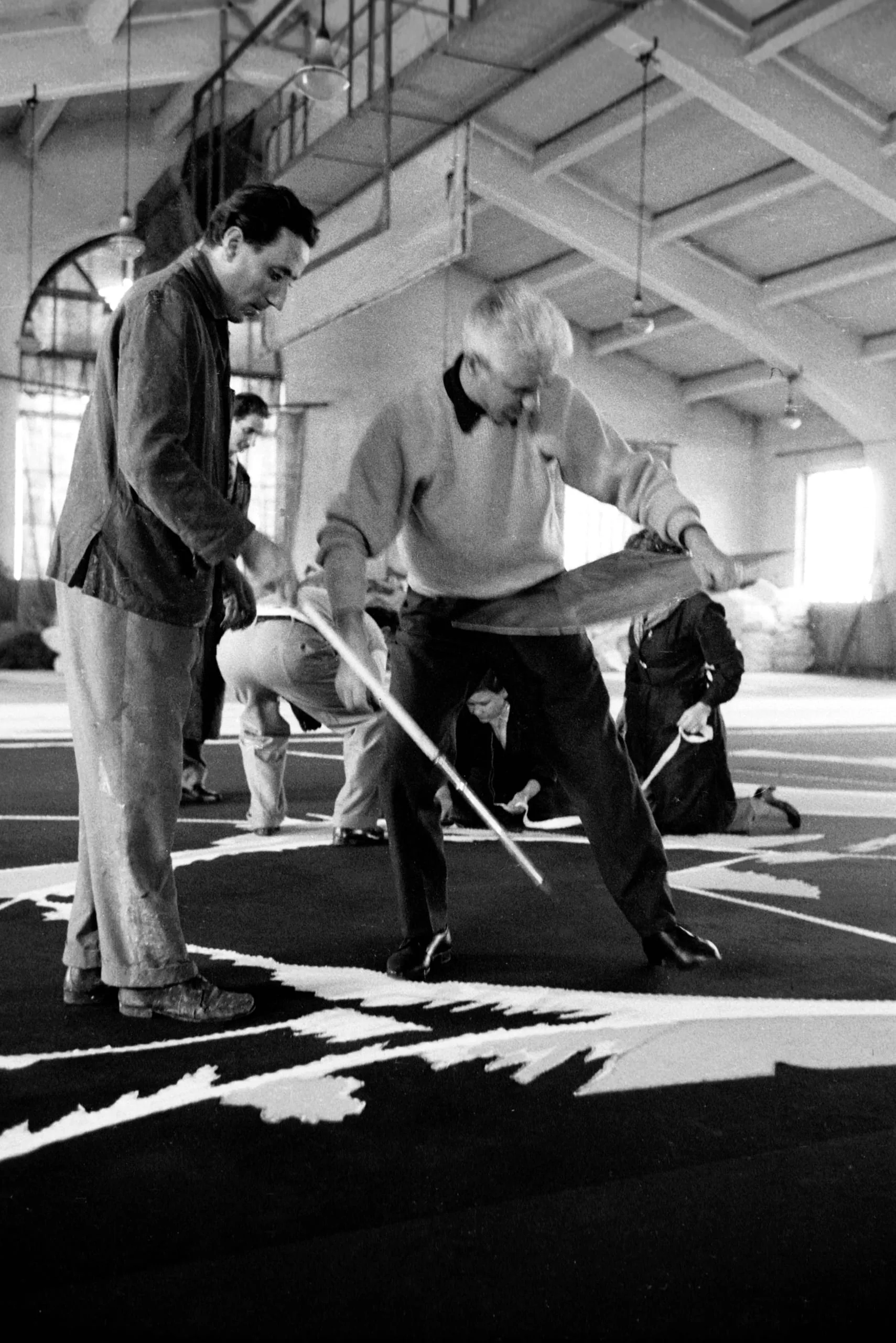 Black and white photograph of several people working on a large dark textile with bold white abstract shapes spread across an industrial floor