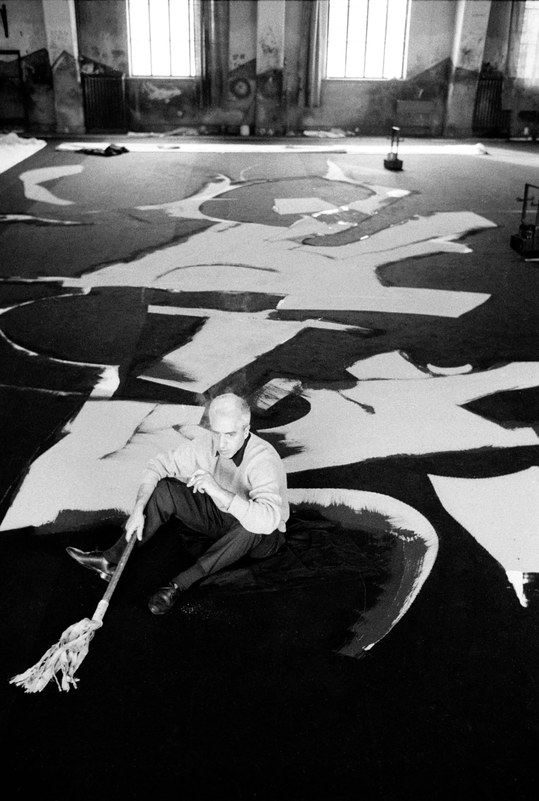 Black and white photograph of a man seated on a large-scale abstract painting laid flat on a studio floor, holding a mop