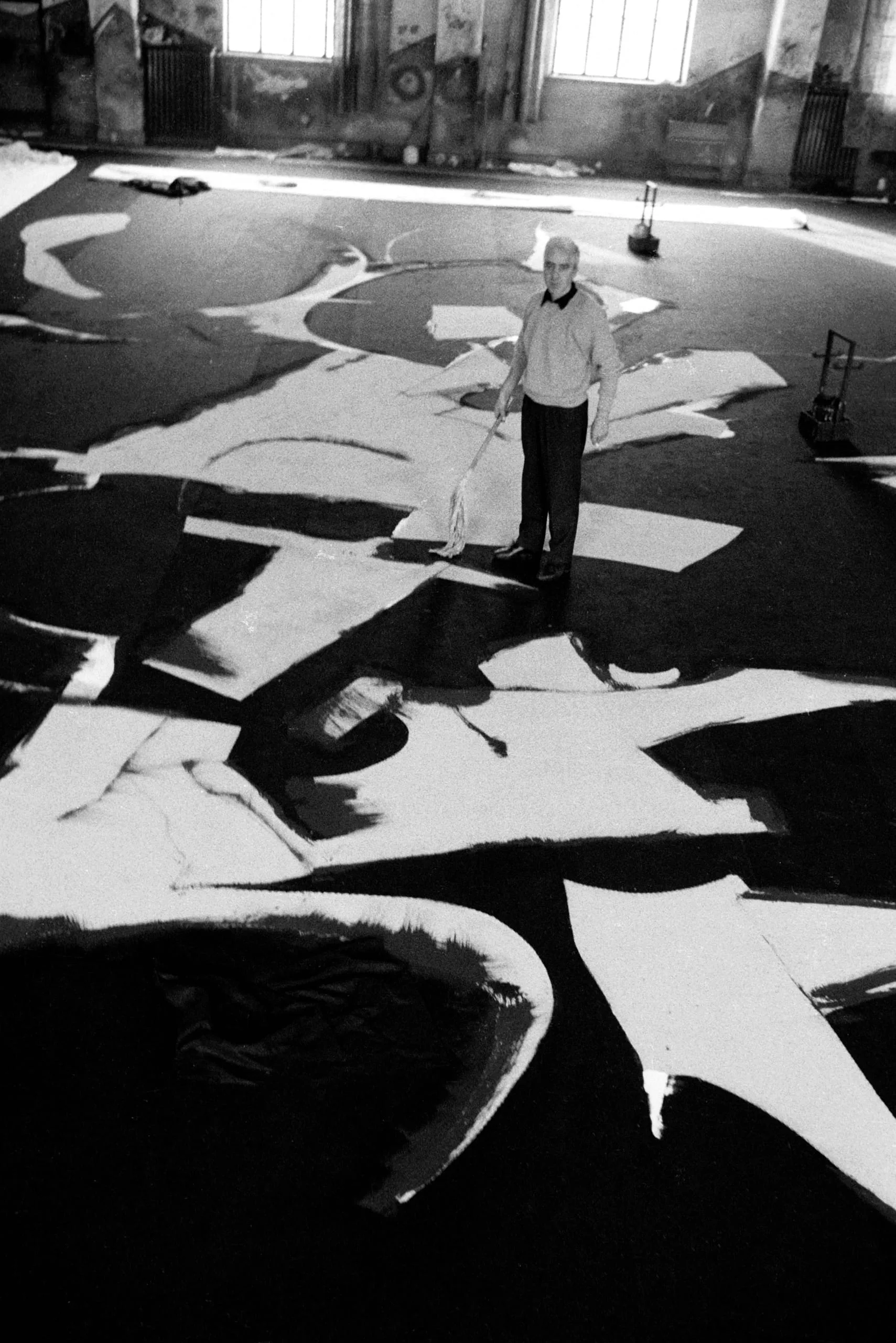 Black and white photograph, man with long-handled brush standing amid a large-scale abstract floor painting of bold black and white brushstrokes in a vast industrial space