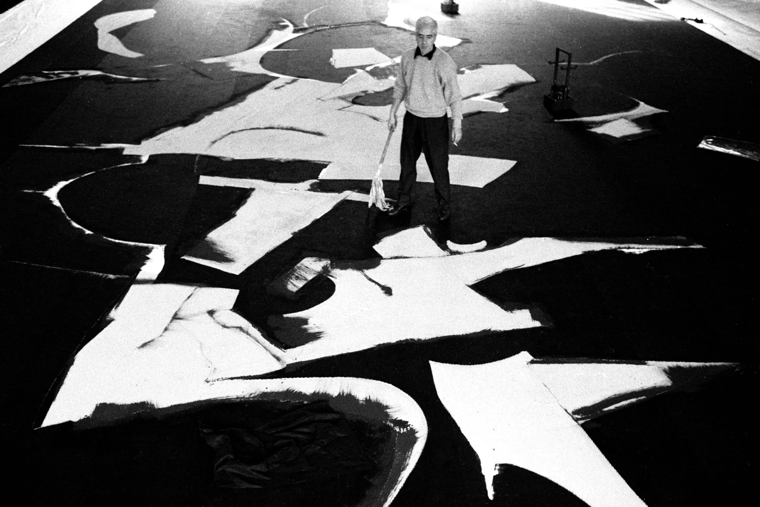 Black and white photograph shot from above, a man with white hair stands amid a vast floor-sized abstract painting of sweeping white shapes on black