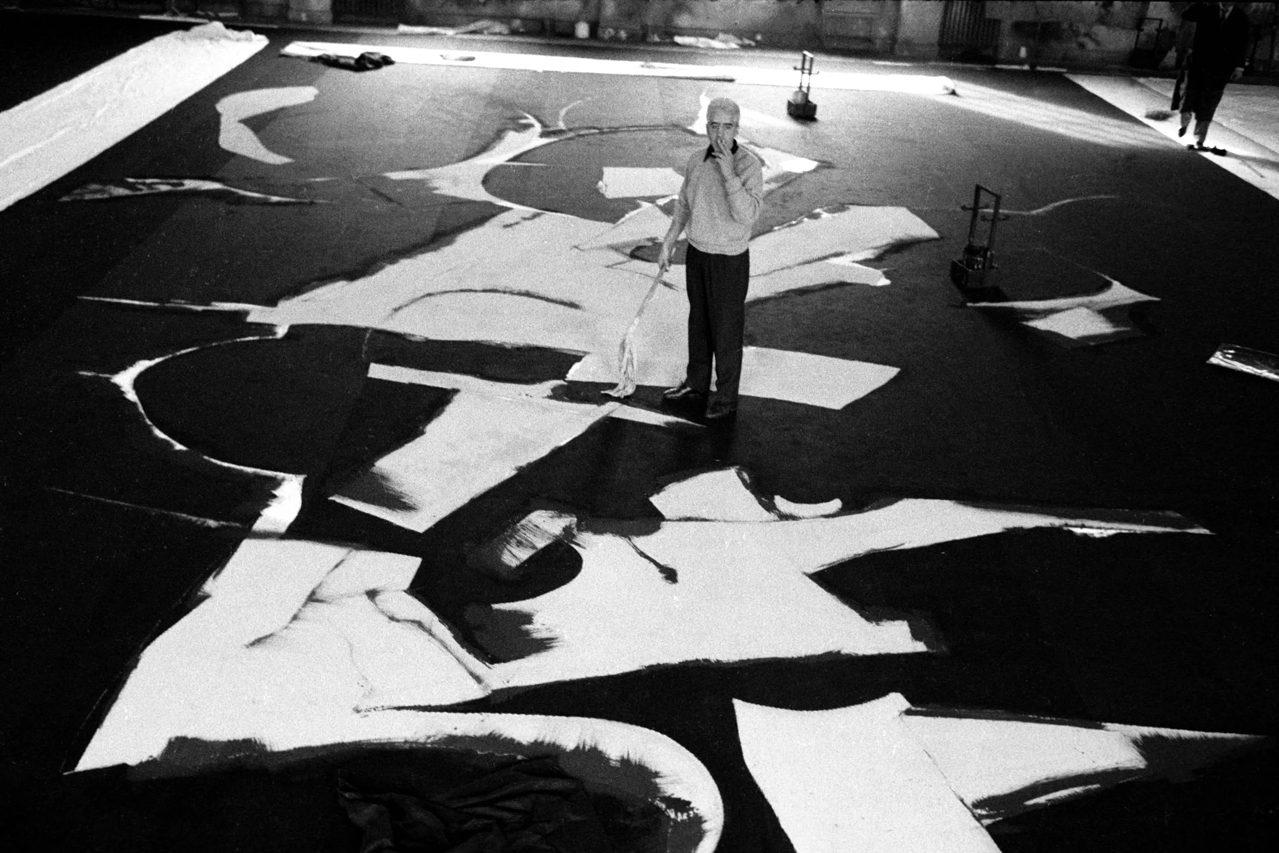 Black and white photograph, overhead view of a man holding a long-handled brush, standing on a large abstract painting spread across a studio floor