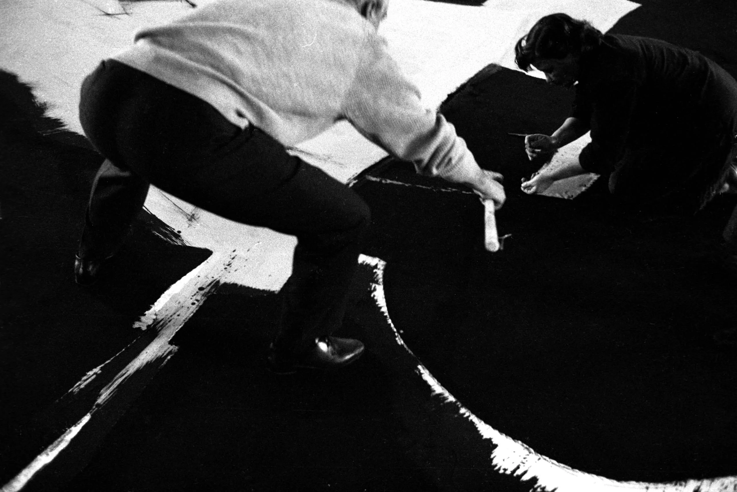 Black and white photograph of two people crouched over a dark floor, applying broad white brushstrokes in a large-scale painting in progress