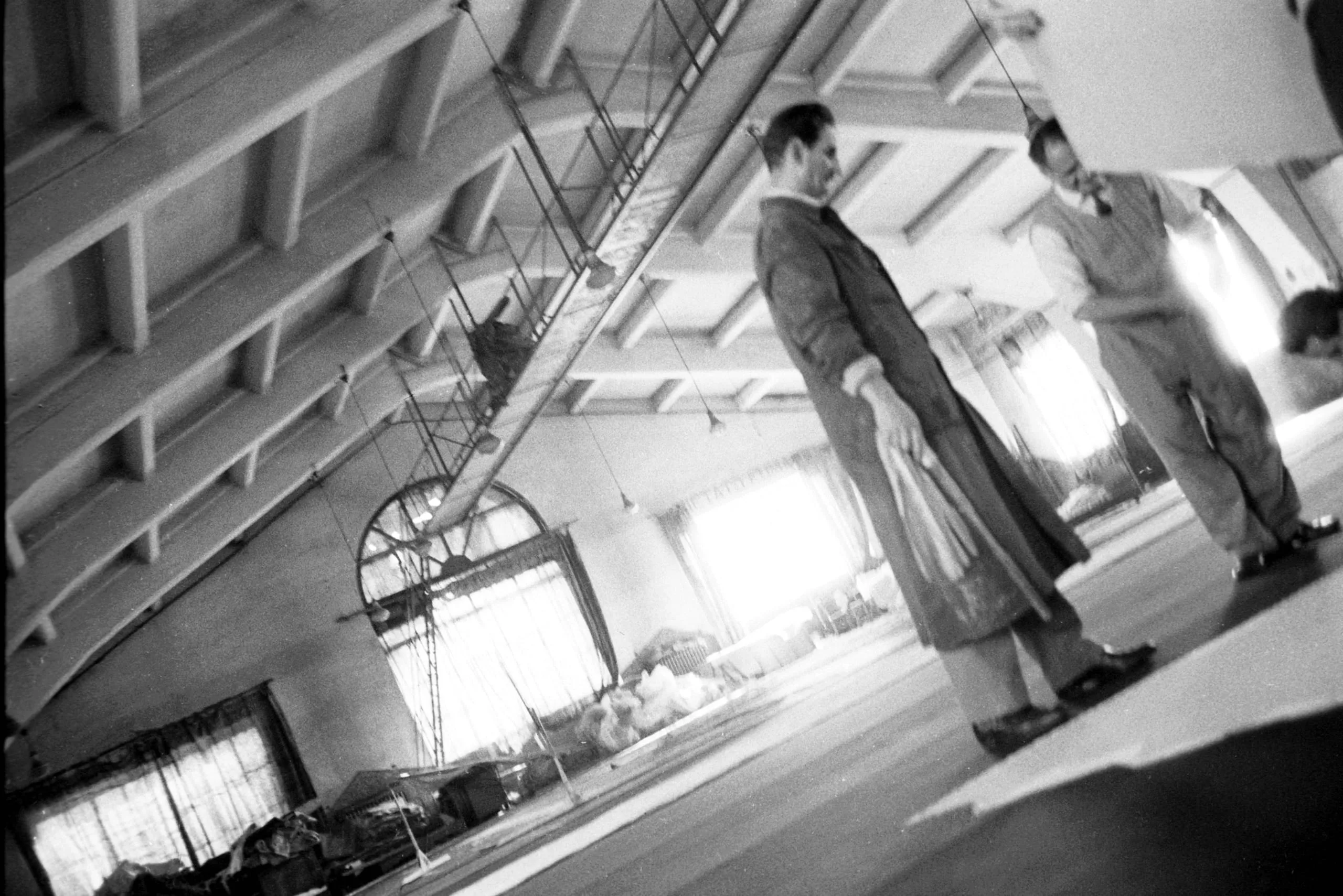 Tilted black and white photograph of two men standing in a large, beamed interior space with a suspended aircraft framework hanging from the ceiling