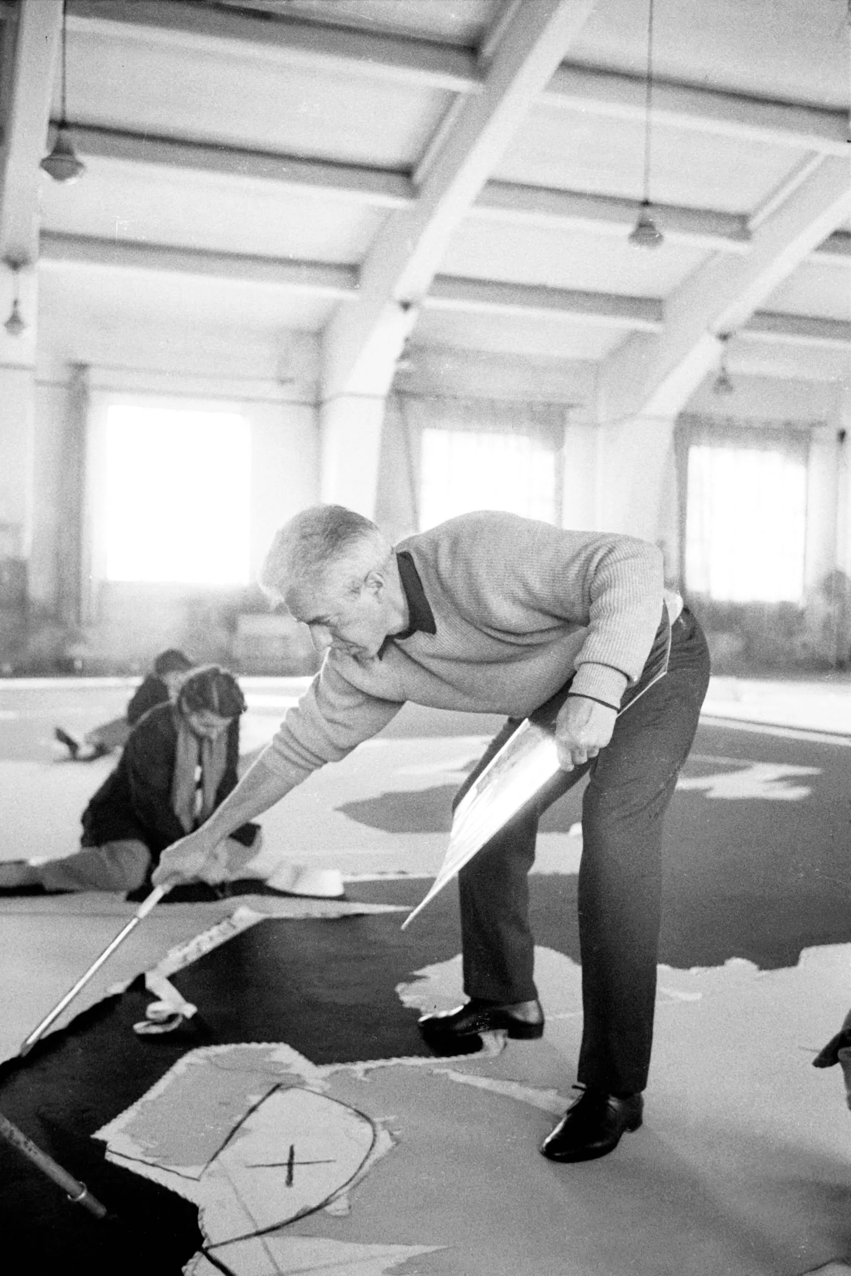 Black and white photograph of a gray-haired man in a sweater bending over a large canvas laid on an industrial floor, holding a long brush and a triangular form