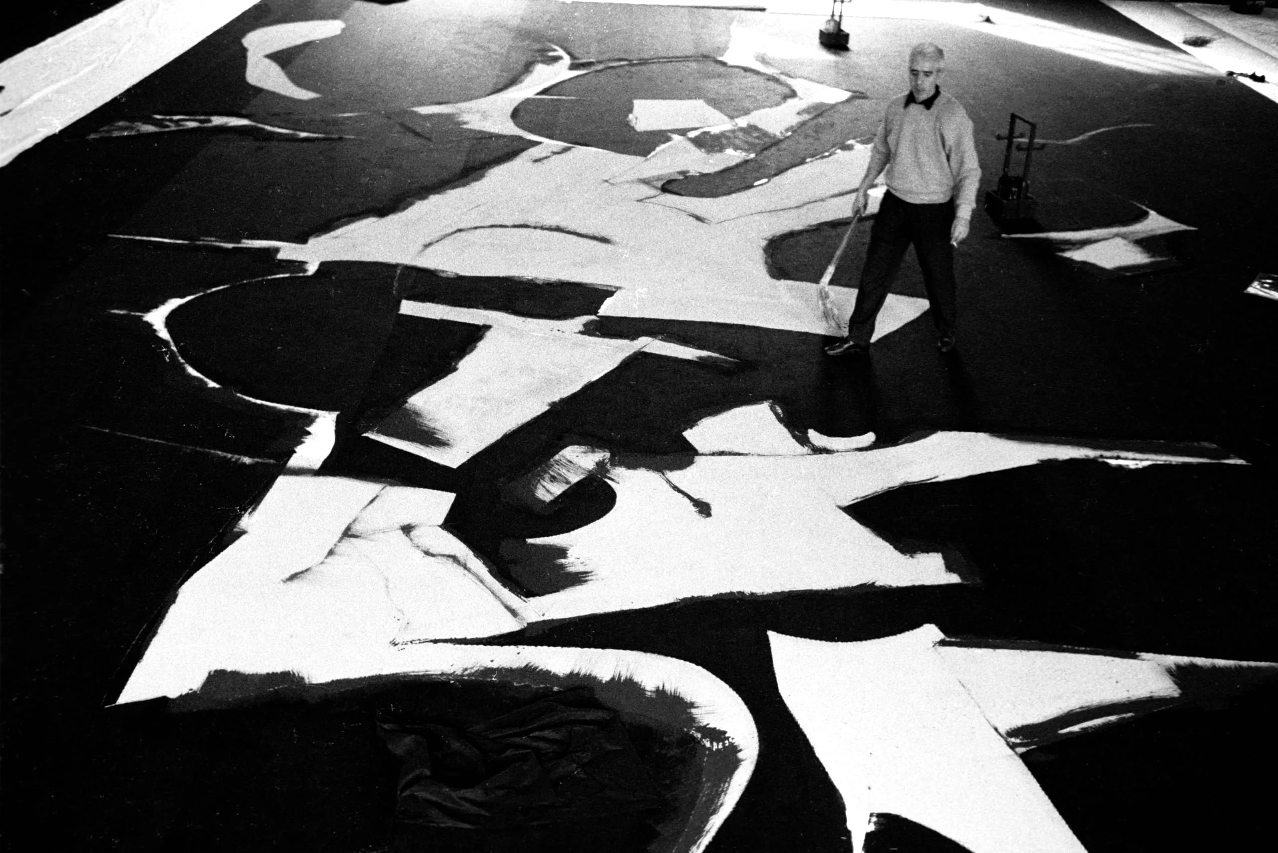 Black and white photograph, shot from above, of a man standing on a vast abstract painting laid on the floor, holding a long-handled brush
