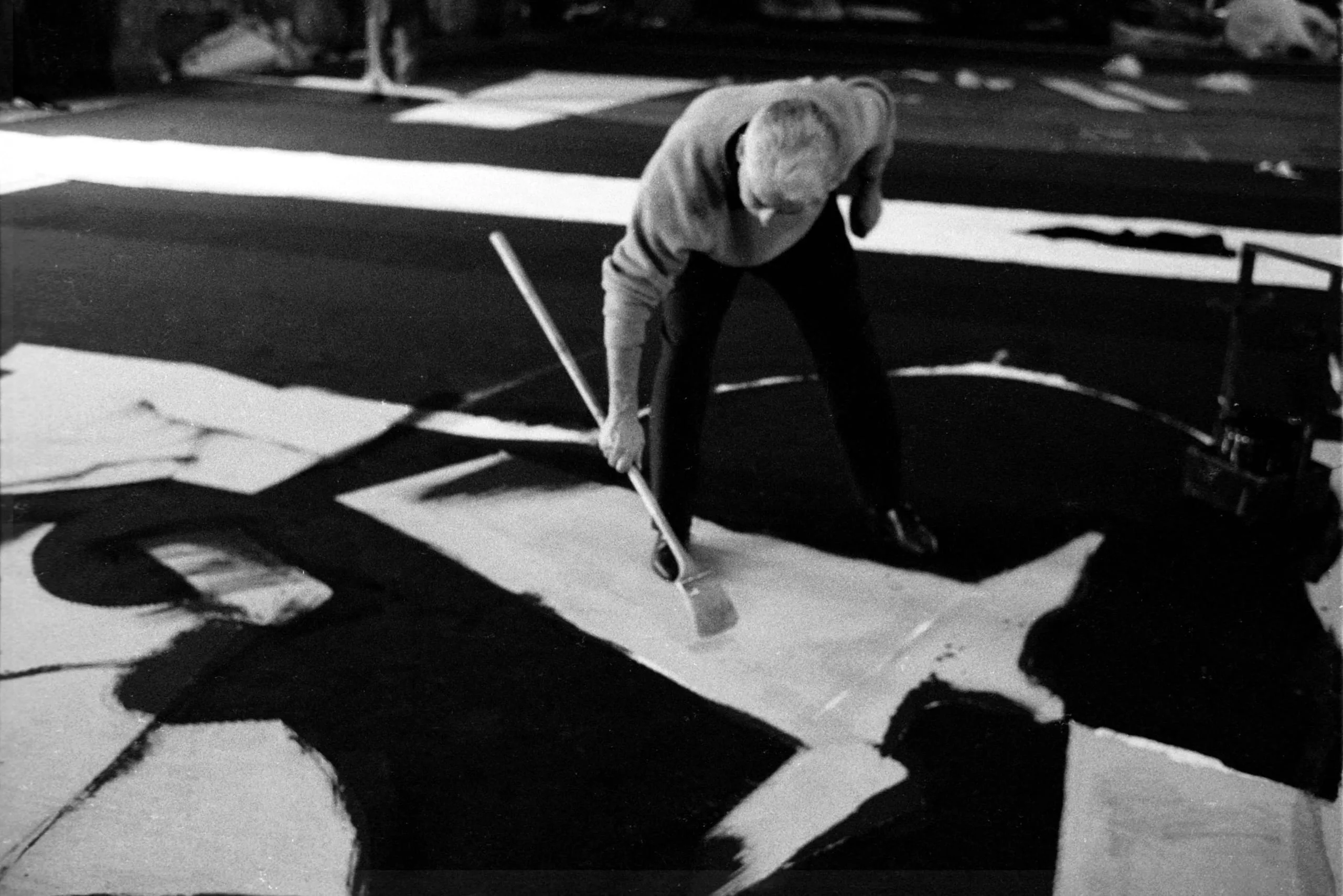 Black and white photograph of a man with white hair bending over a large floor canvas, applying black paint with a wide brush in a studio
