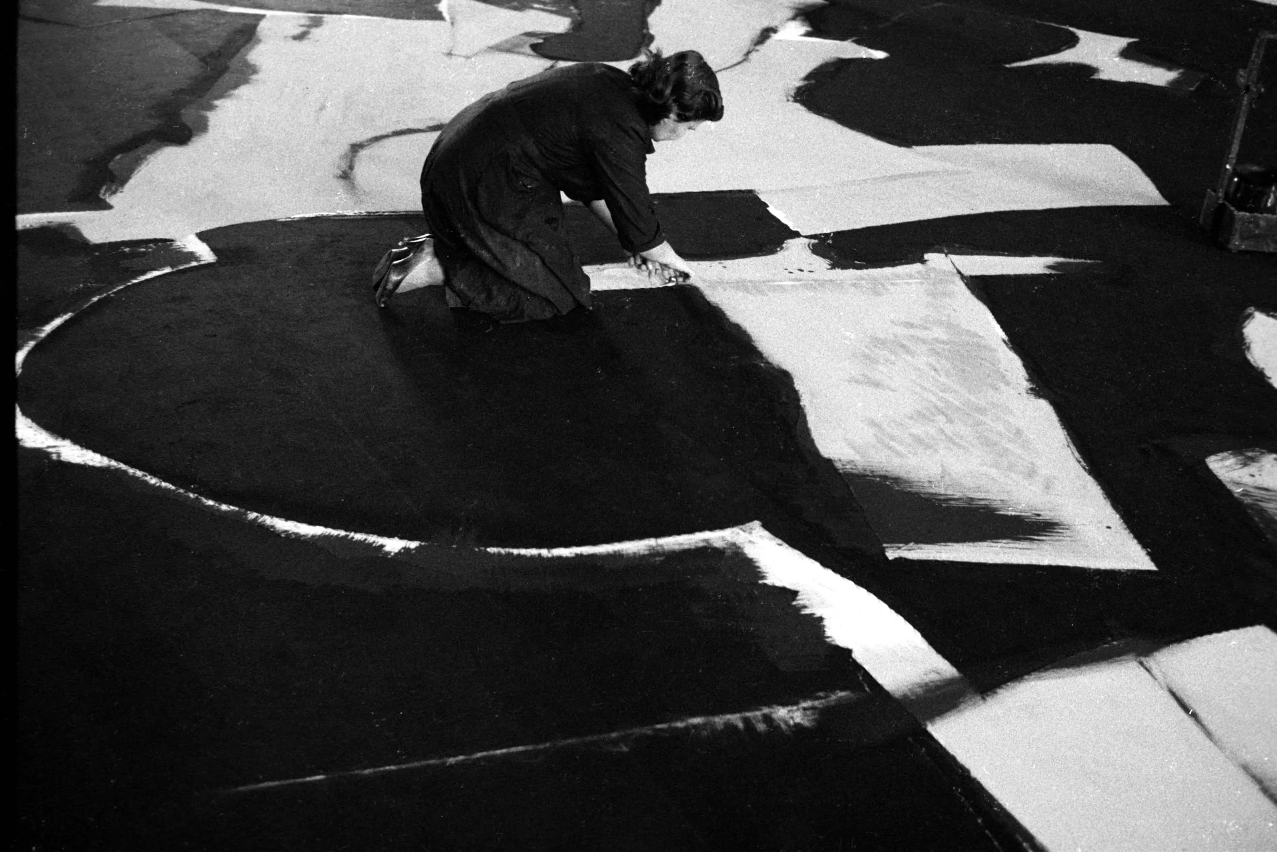 Black and white photograph looking down at a person kneeling on a large floor surface, painting bold black and white abstract forms