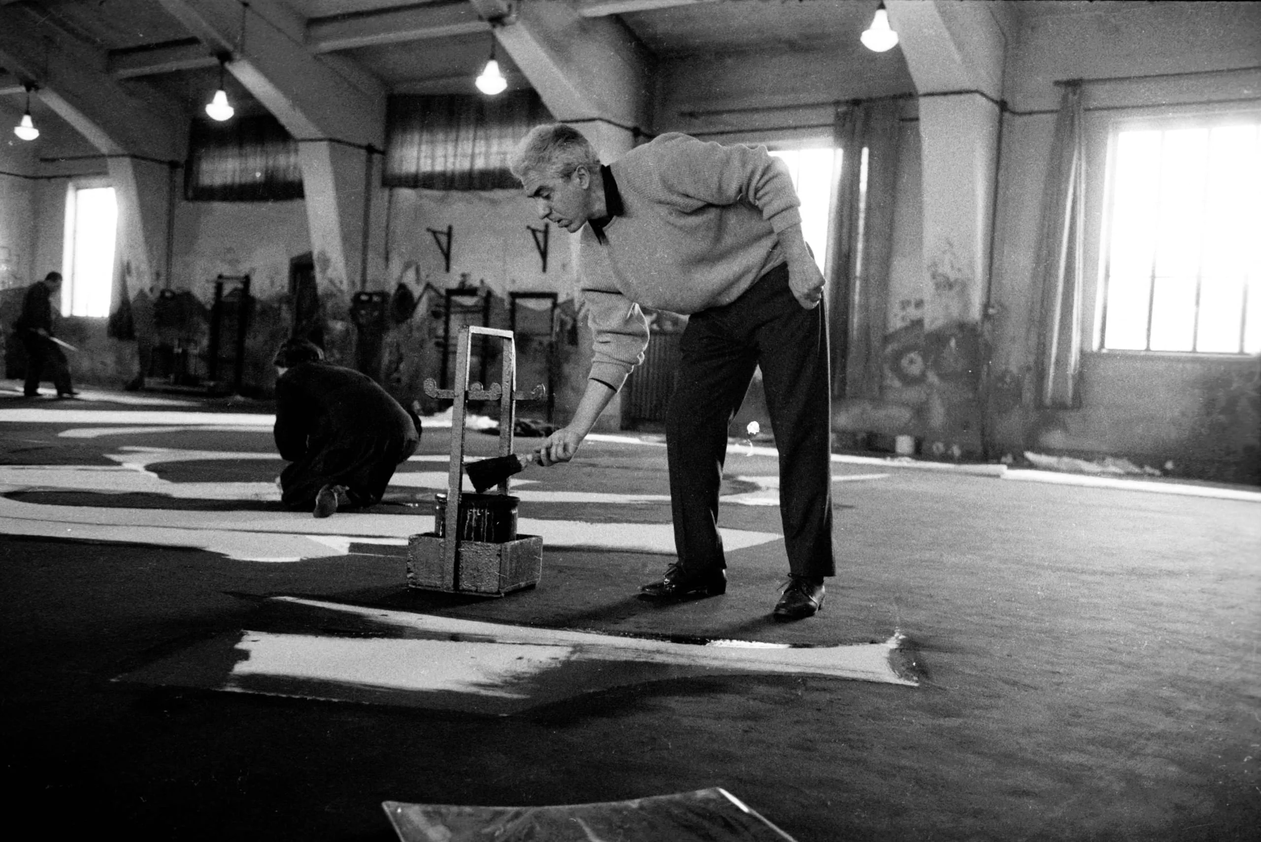 Black and white photograph of two men working on large dark panels laid flat on the floor of an industrial interior space
