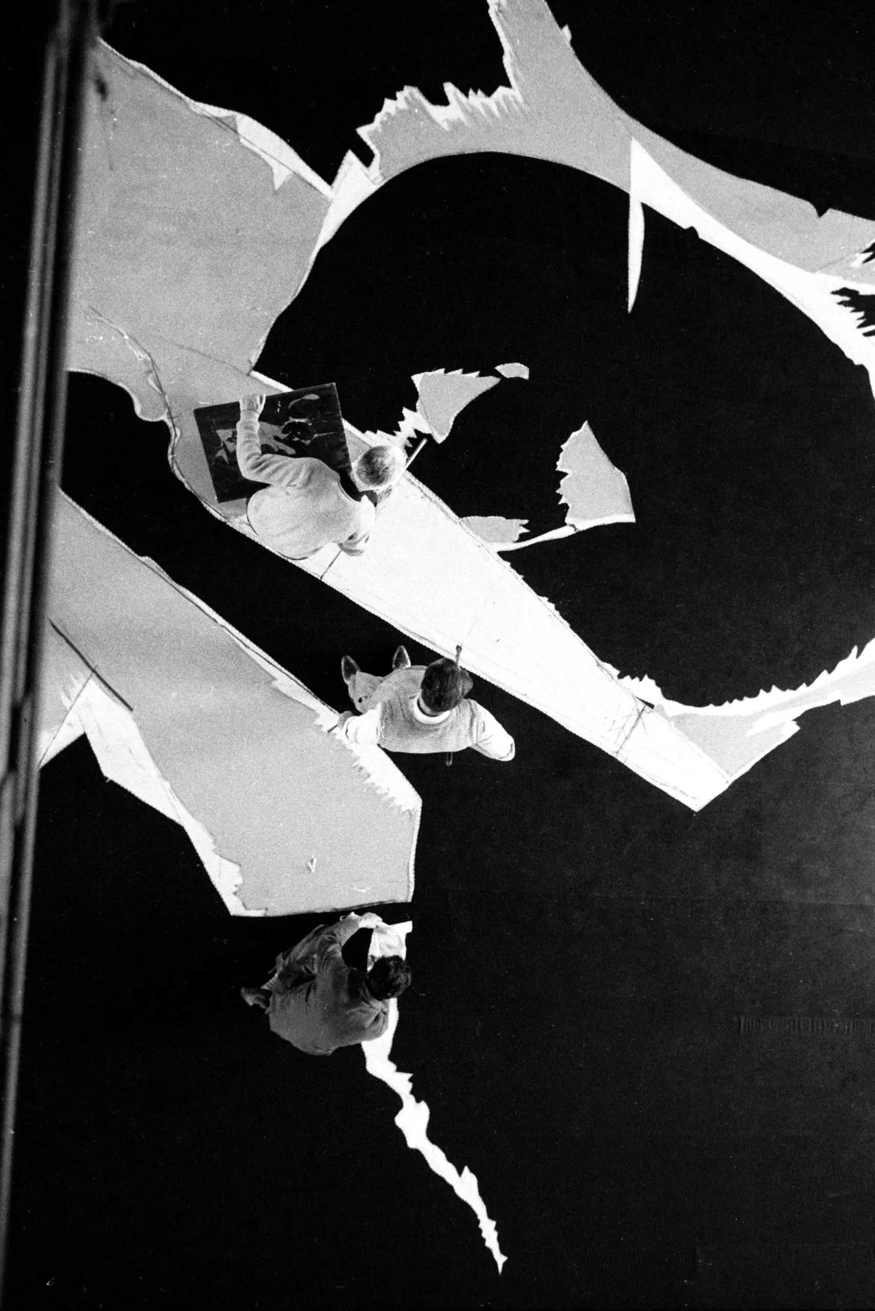 Black and white photograph shot from directly overhead, three figures in white clothing working among large torn white sheets against a black ground