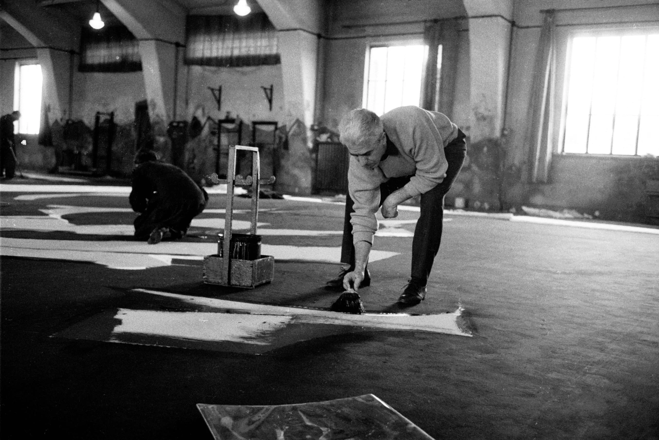 Black and white photograph of two men working on large painted forms laid flat on the floor of a bare industrial studio