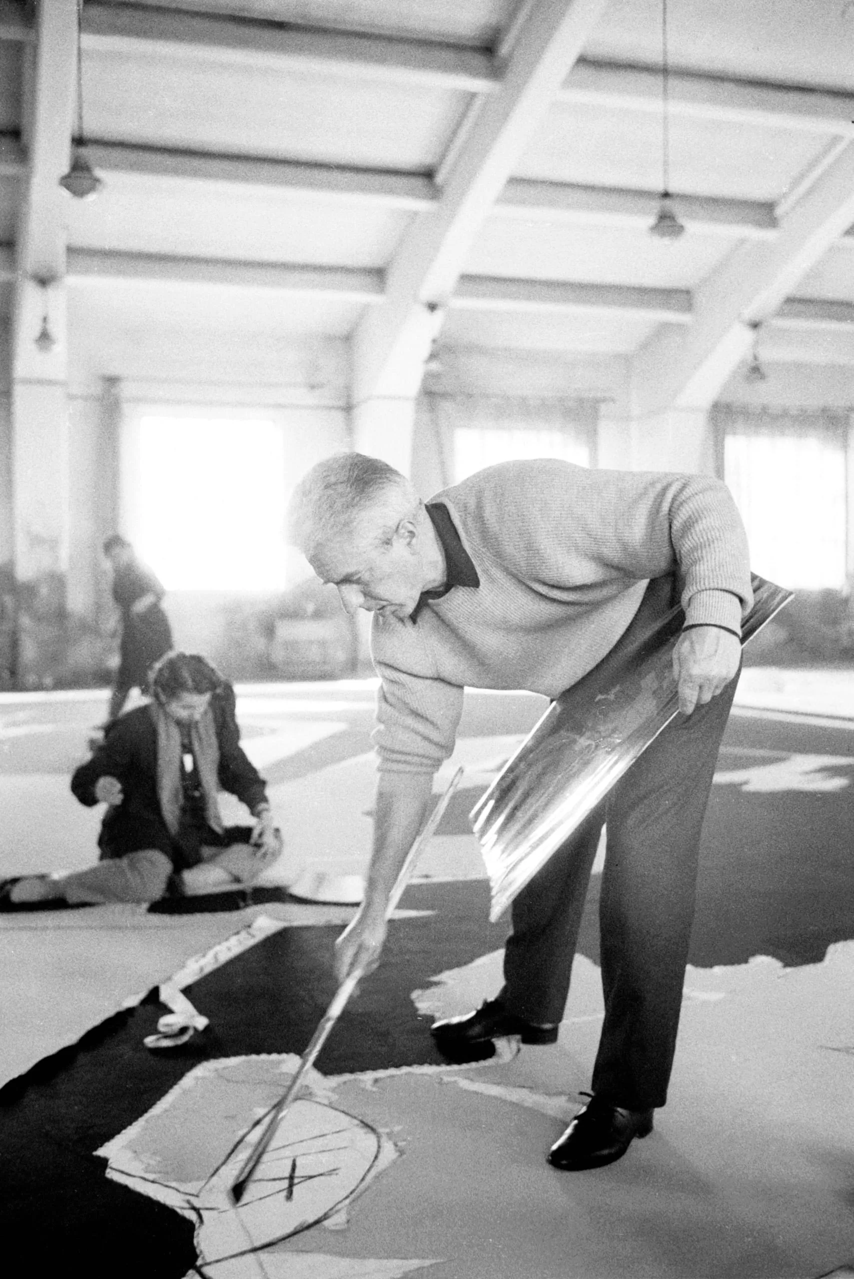 Black and white photograph of an older man bending over a large canvas on a warehouse floor, sweeping a long-handled brush in a wide arc