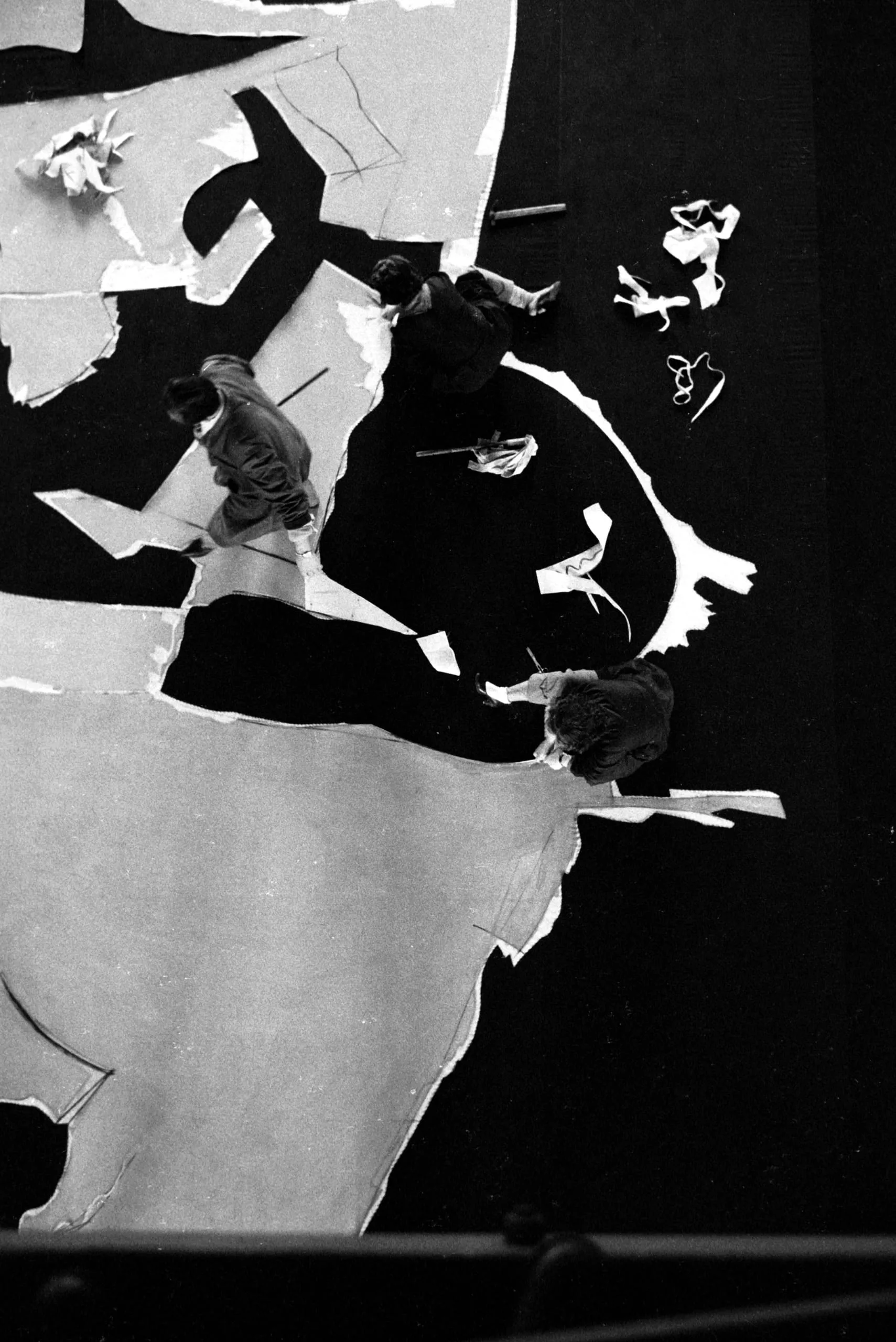 Black and white photograph shot from directly above, two figures in dark clothing working on a large surface of torn white paper against a black ground