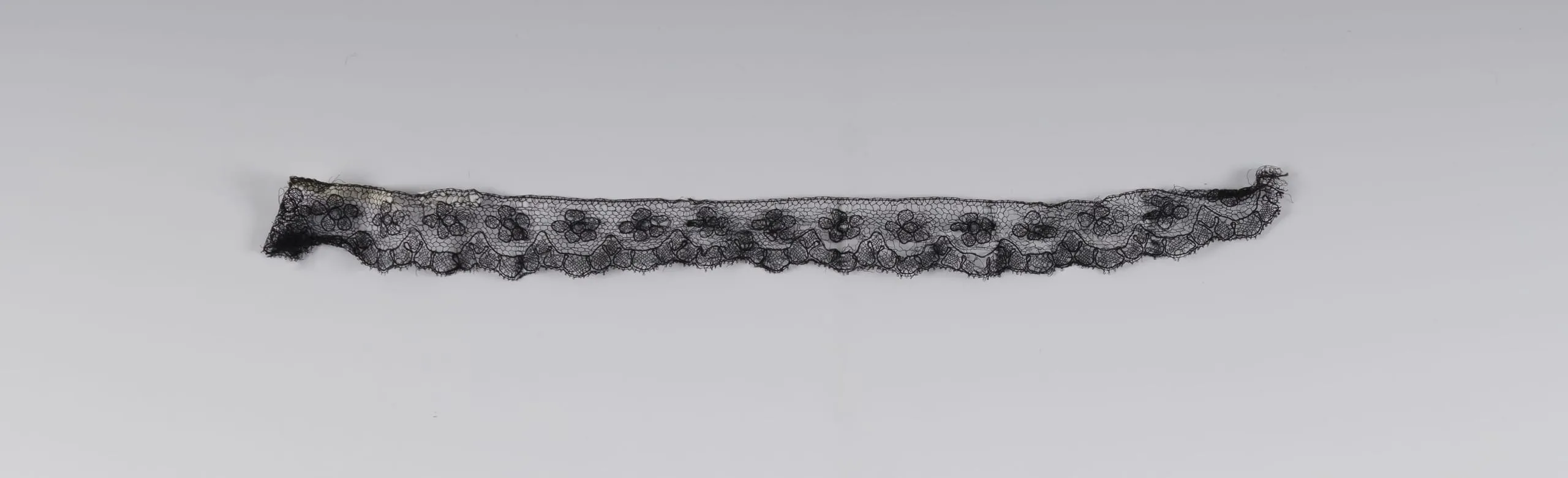 Narrow strip of black lace with a repeating floral pattern on an open mesh ground and a scalloped lower edge, laid flat against a pale gray background