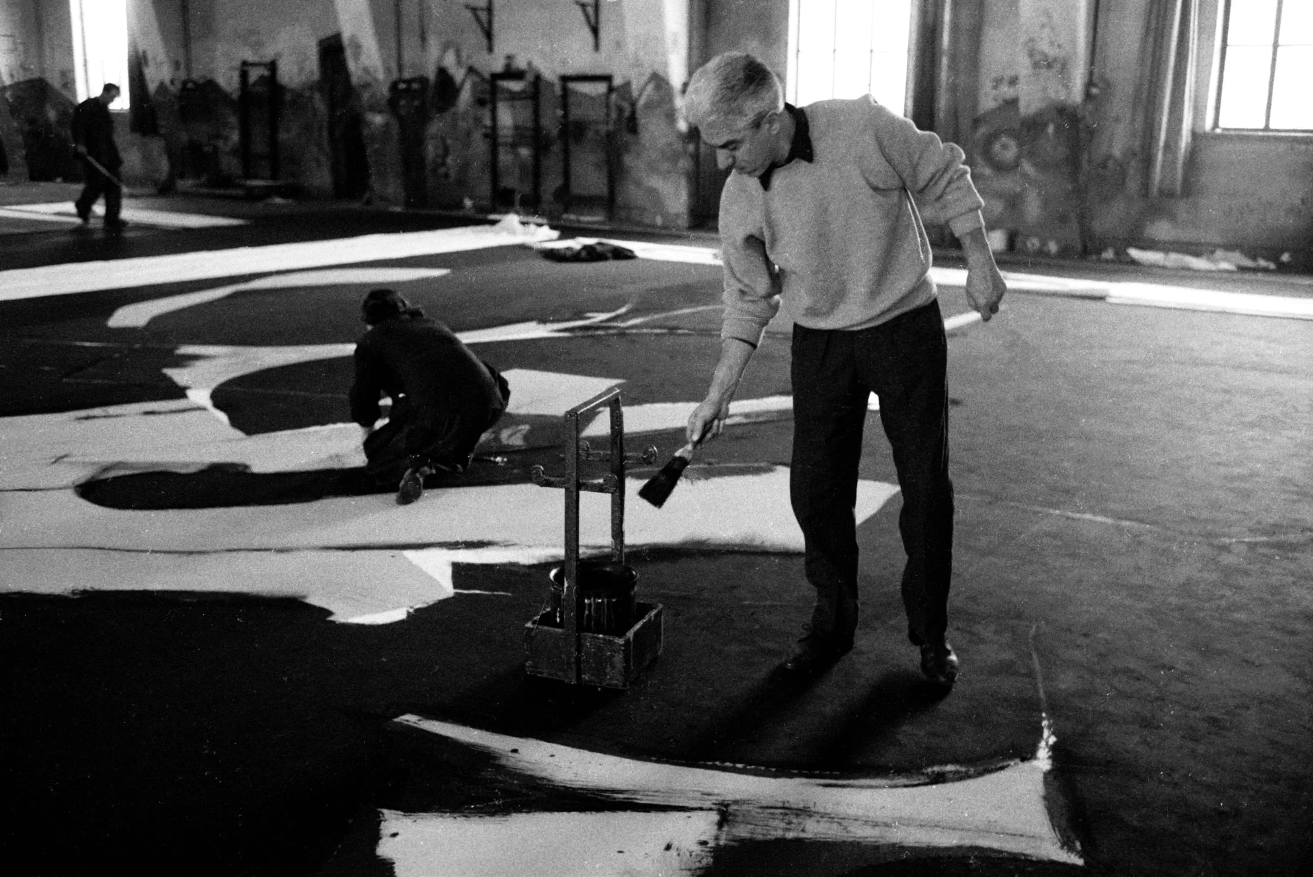 Black and white photograph of three people applying black paint to a large-scale canvas laid flat on a concrete floor in an industrial studio