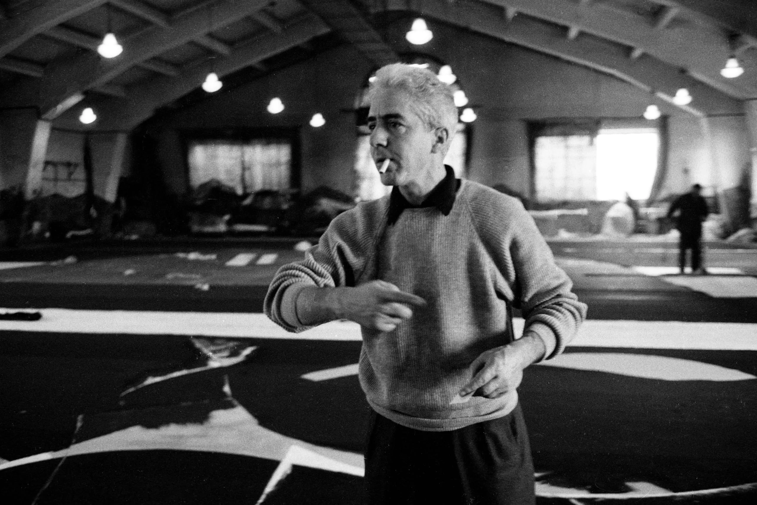 Black and white photograph of a white-haired man mid-gesture in a large studio, large-scale painted canvas spread across the floor behind him