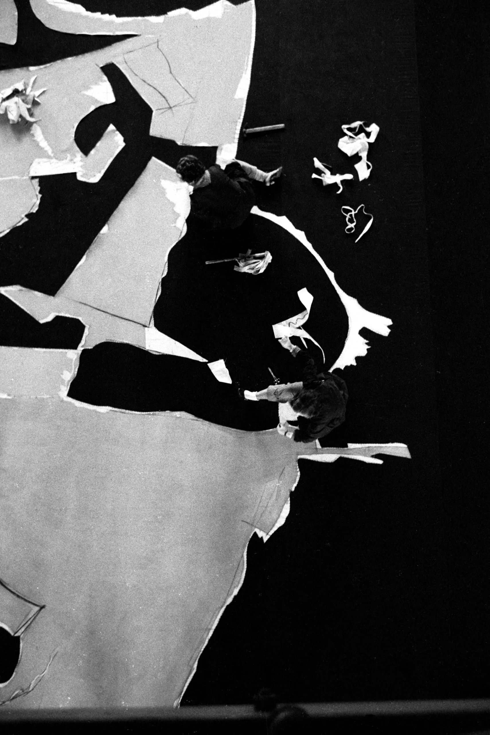 Black and white photograph shot from directly above, two dark-clothed figures kneeling on a large cut-paper or painted form with bold black and white shapes spread across a dark floor
