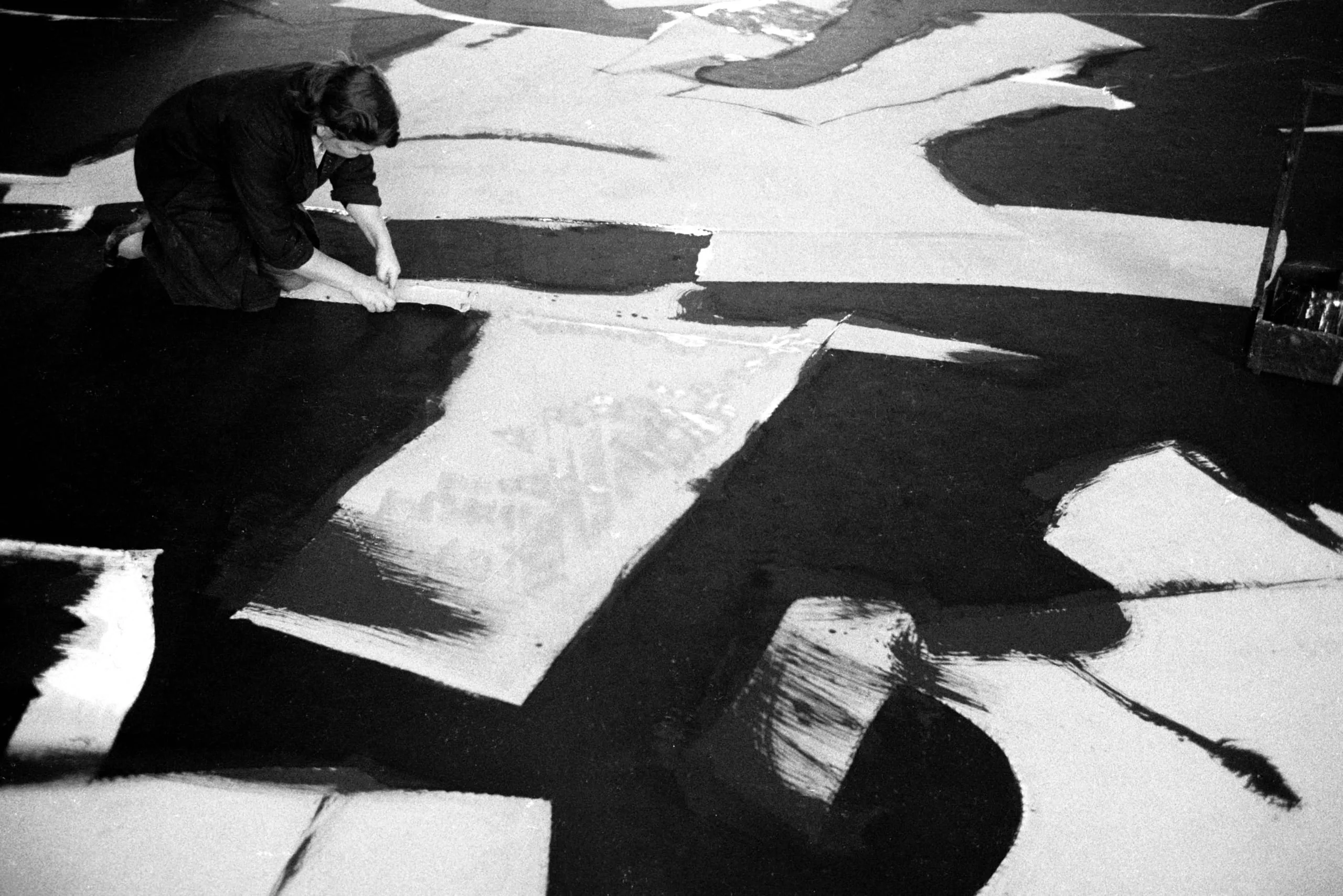 Black and white photograph of a figure in dark clothing crouched on the floor, painting a large canvas with bold black brushstrokes