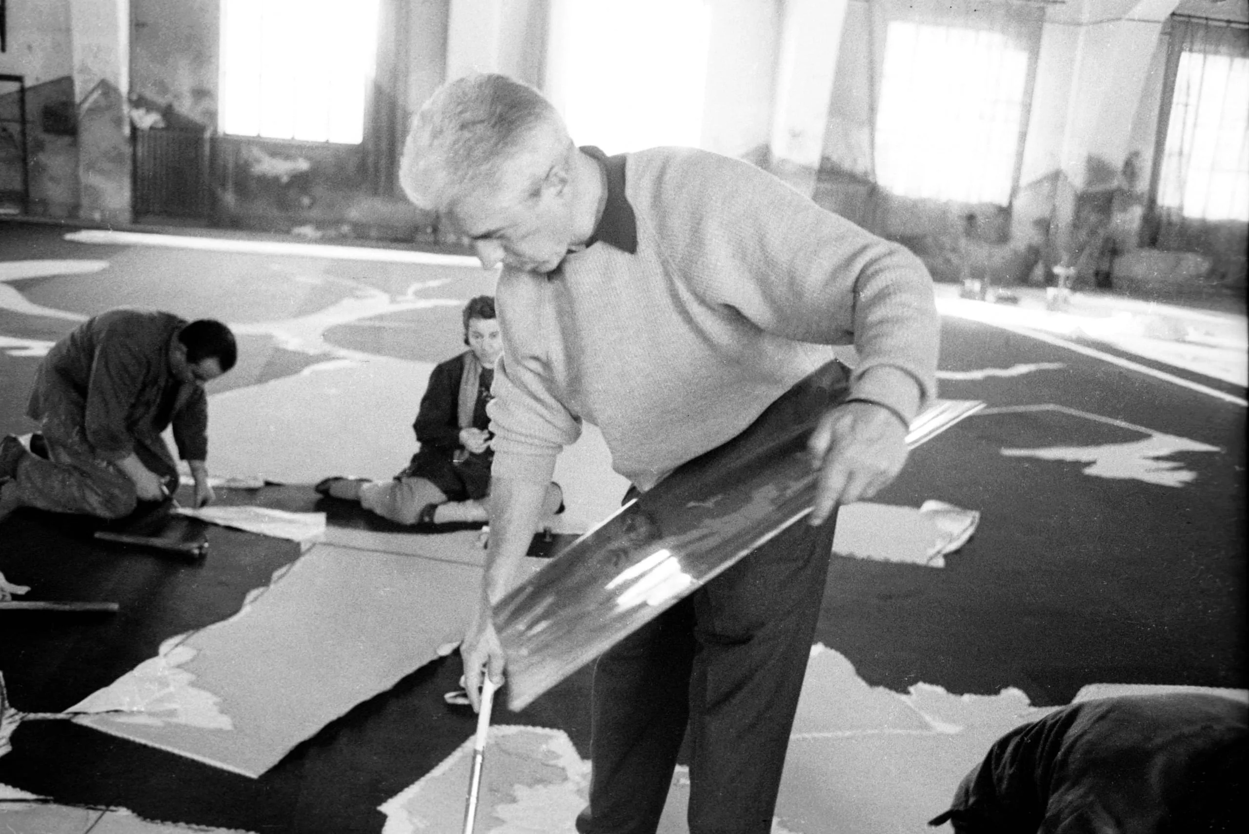 Black and white photograph of three people working on a large abstract painting laid flat on a studio floor, the nearest figure dragging a long tool across a dark glossy surface