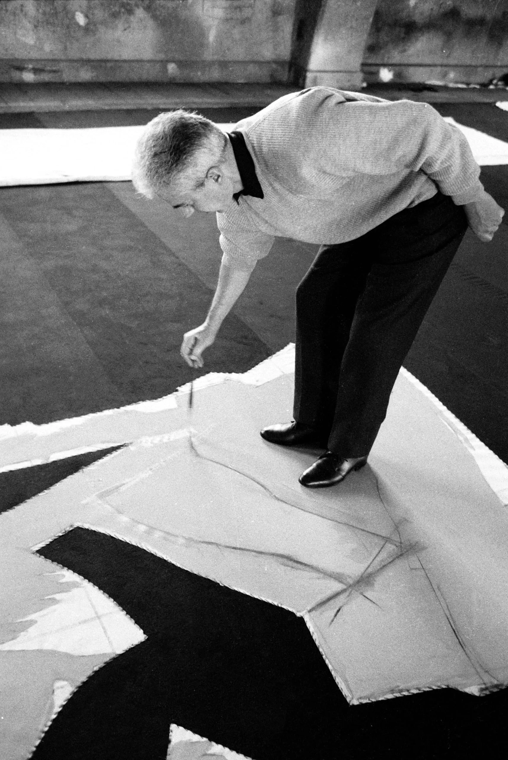 Black and white photograph of a man in a light sweater and dark trousers bending over a large canvas on the floor, working on a bold abstract composition