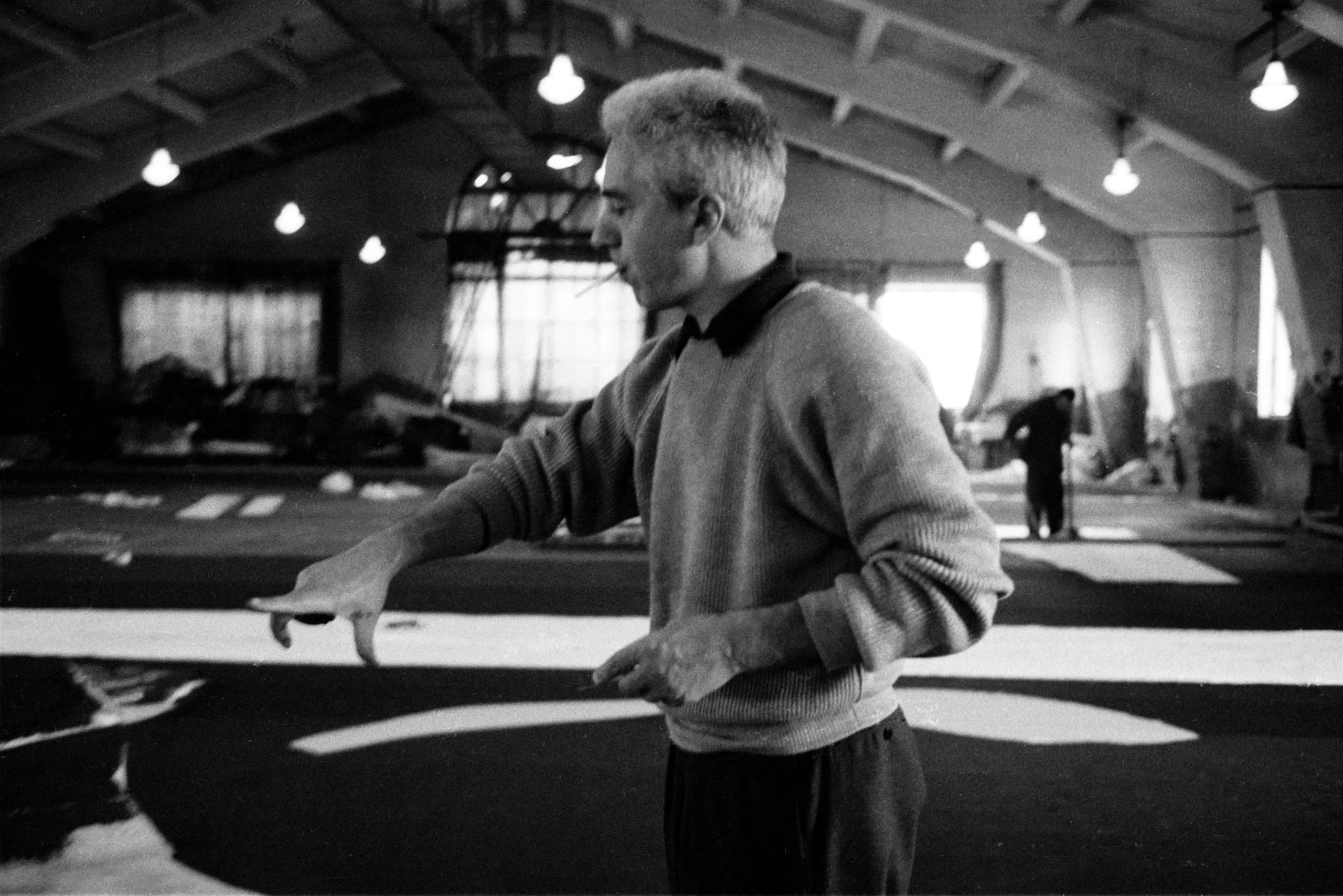 Black and white photograph of a man in a ribbed sweater gesturing toward a large canvas spread on the floor of a barn-like studio space