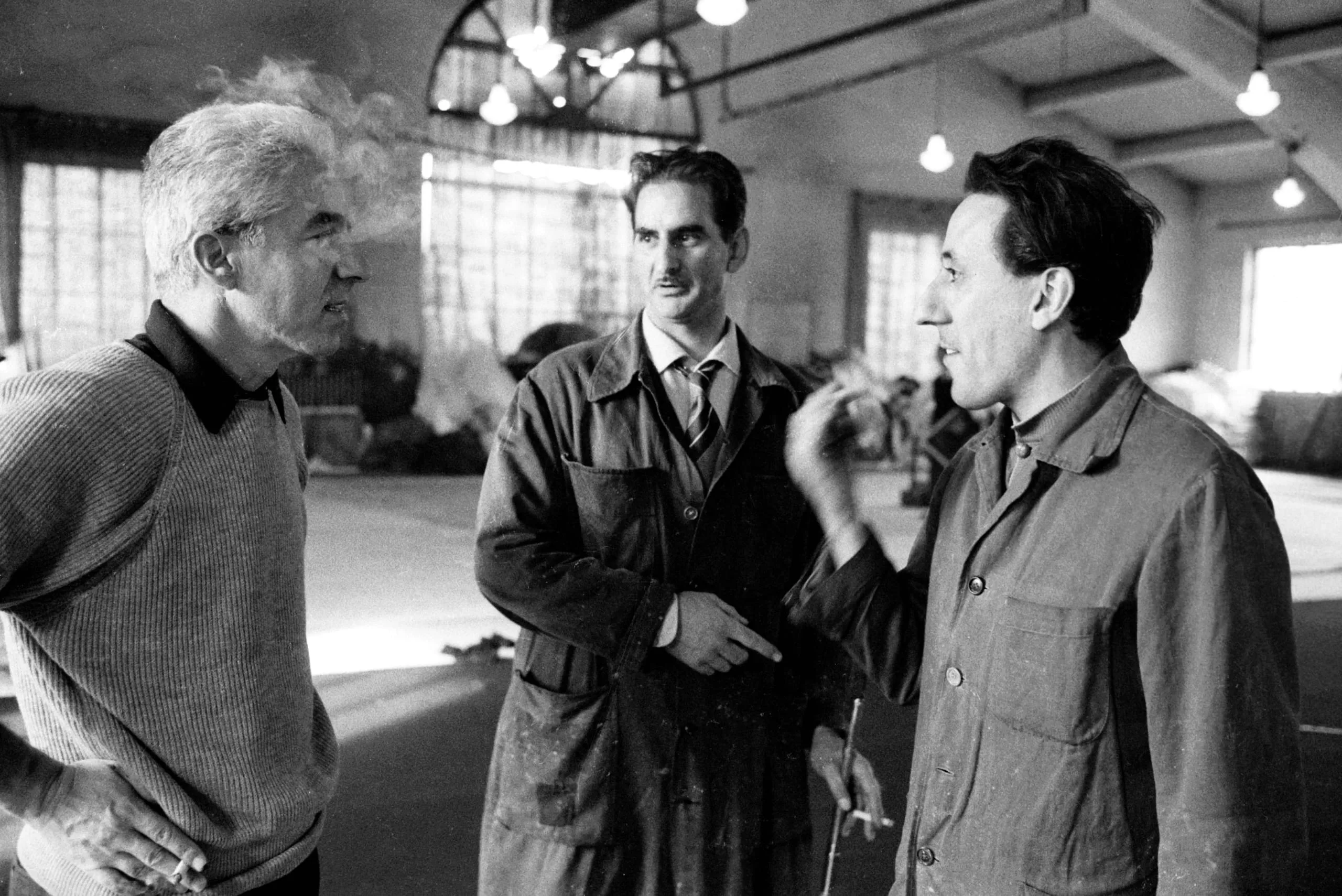 Black and white photograph of three men in conversation inside a large industrial interior, two wearing dark work coats, one in a light sweater