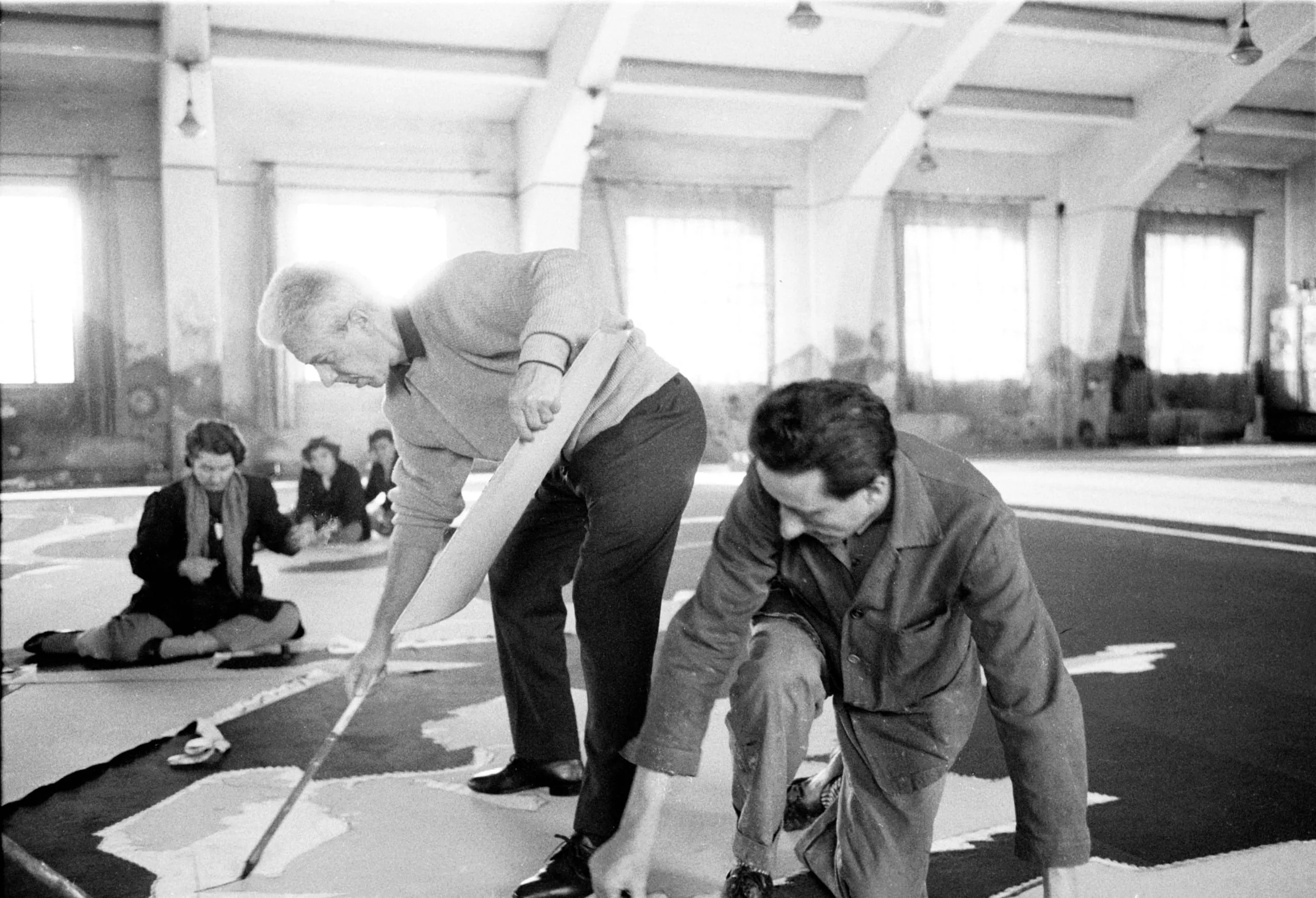 Black and white photograph of two men bent over a large painted canvas laid flat on a floor in an industrial space, while several onlookers sit cross-legged in the background