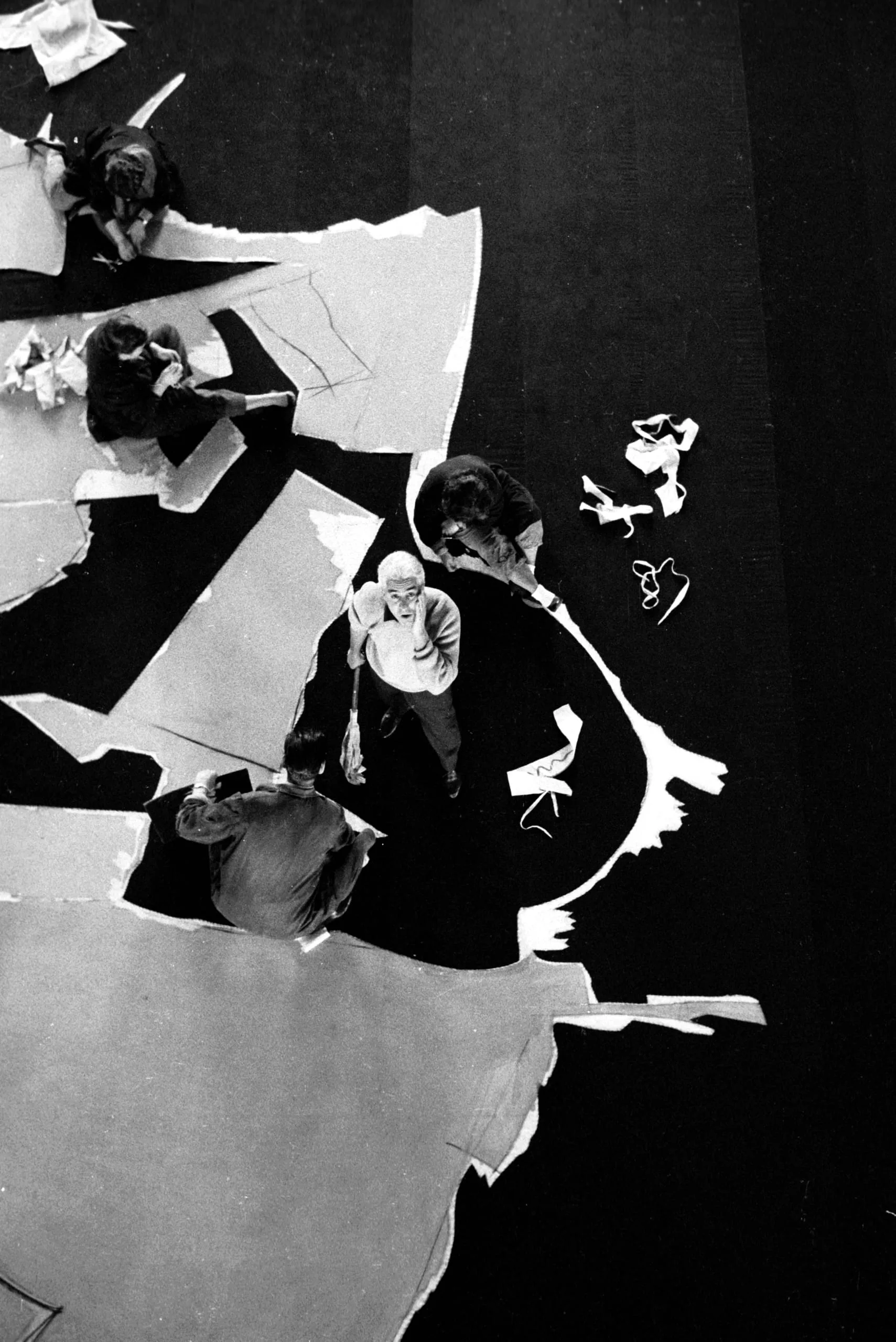 Black and white photograph shot from directly overhead, four figures standing among large irregular white paper cutouts on a dark floor