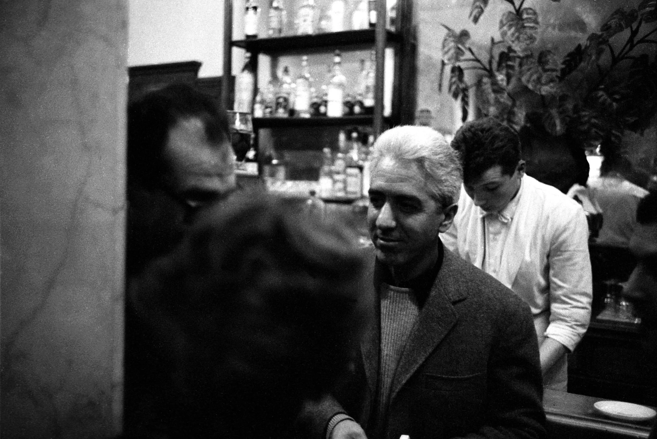 Black and white photograph of several people gathered inside a dimly lit bar or restaurant, with shelves of bottles and a large leafy plant visible in the background