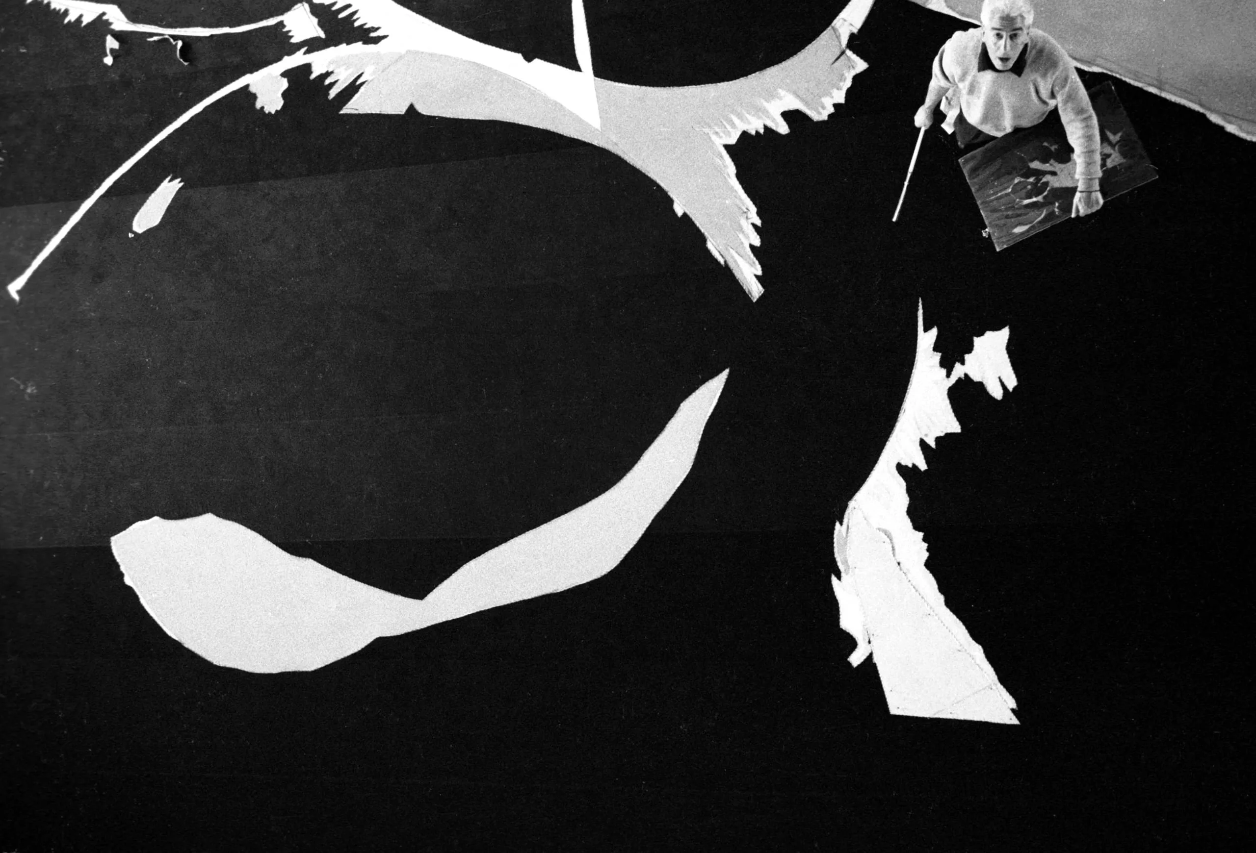 Black and white photograph shot from directly above, showing white paper cutout shapes arranged on a black floor, with a white-haired figure in the upper right corner holding a long implement