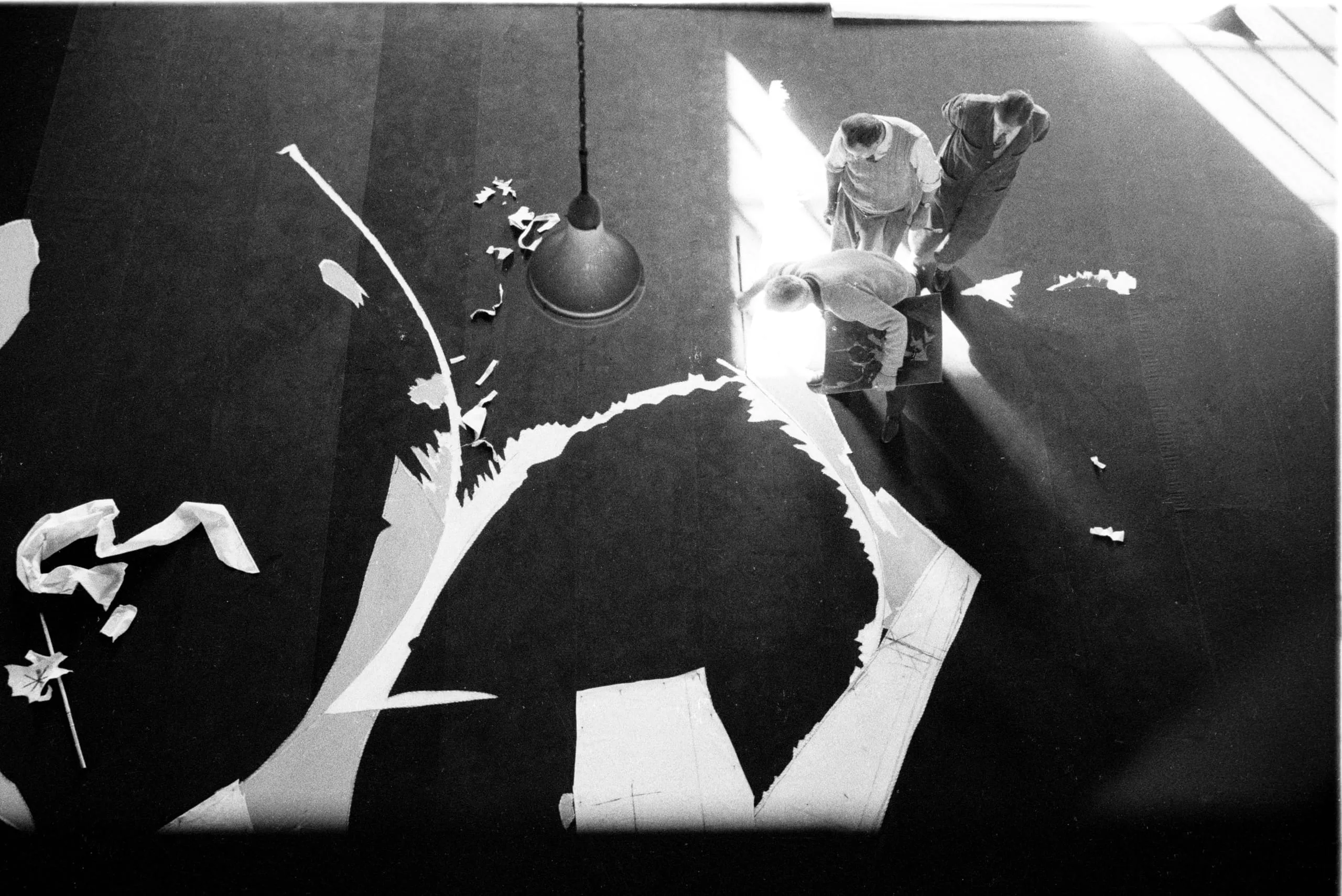 Black and white overhead photograph of three figures working on a large-scale black and white composition spread across a studio floor, with a pendant lamp hanging above