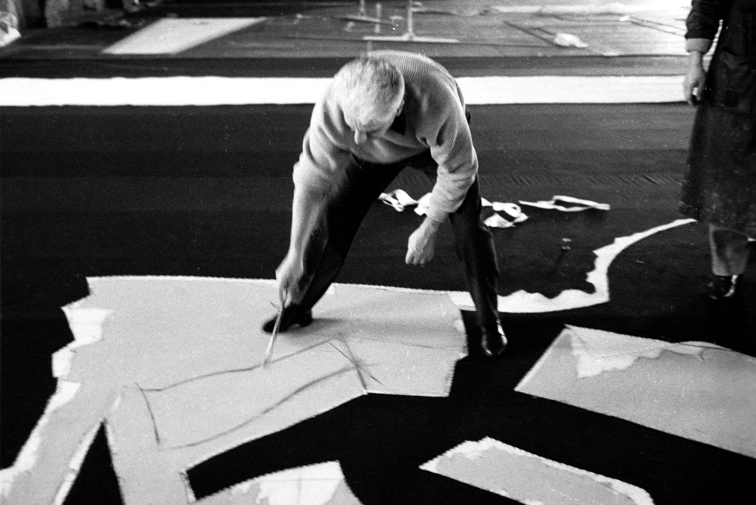 Black and white photograph of a gray-haired man bent over a large abstract canvas laid flat on the floor, applying marks with a long implement