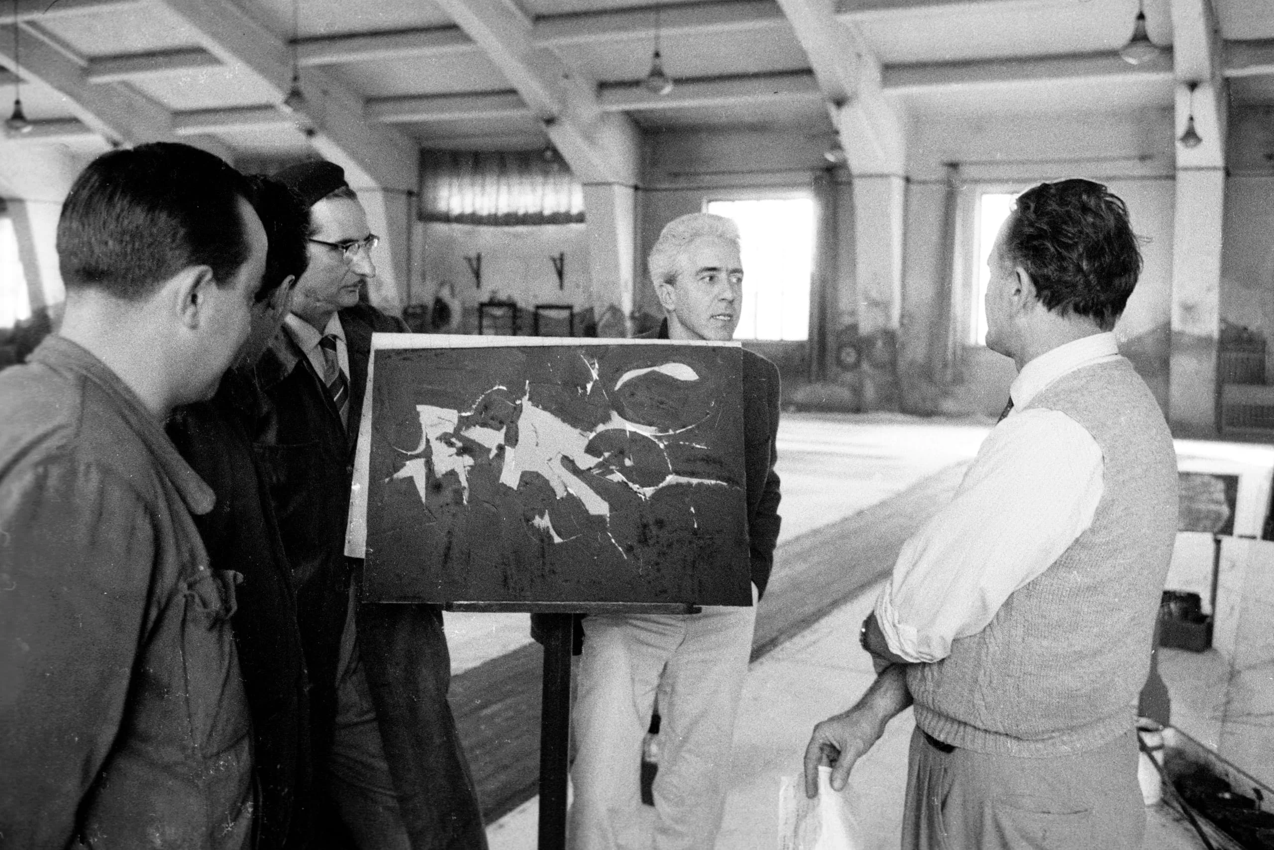 Black and white photograph of four men gathered around an abstract painting on an easel inside a large, open studio or workshop space