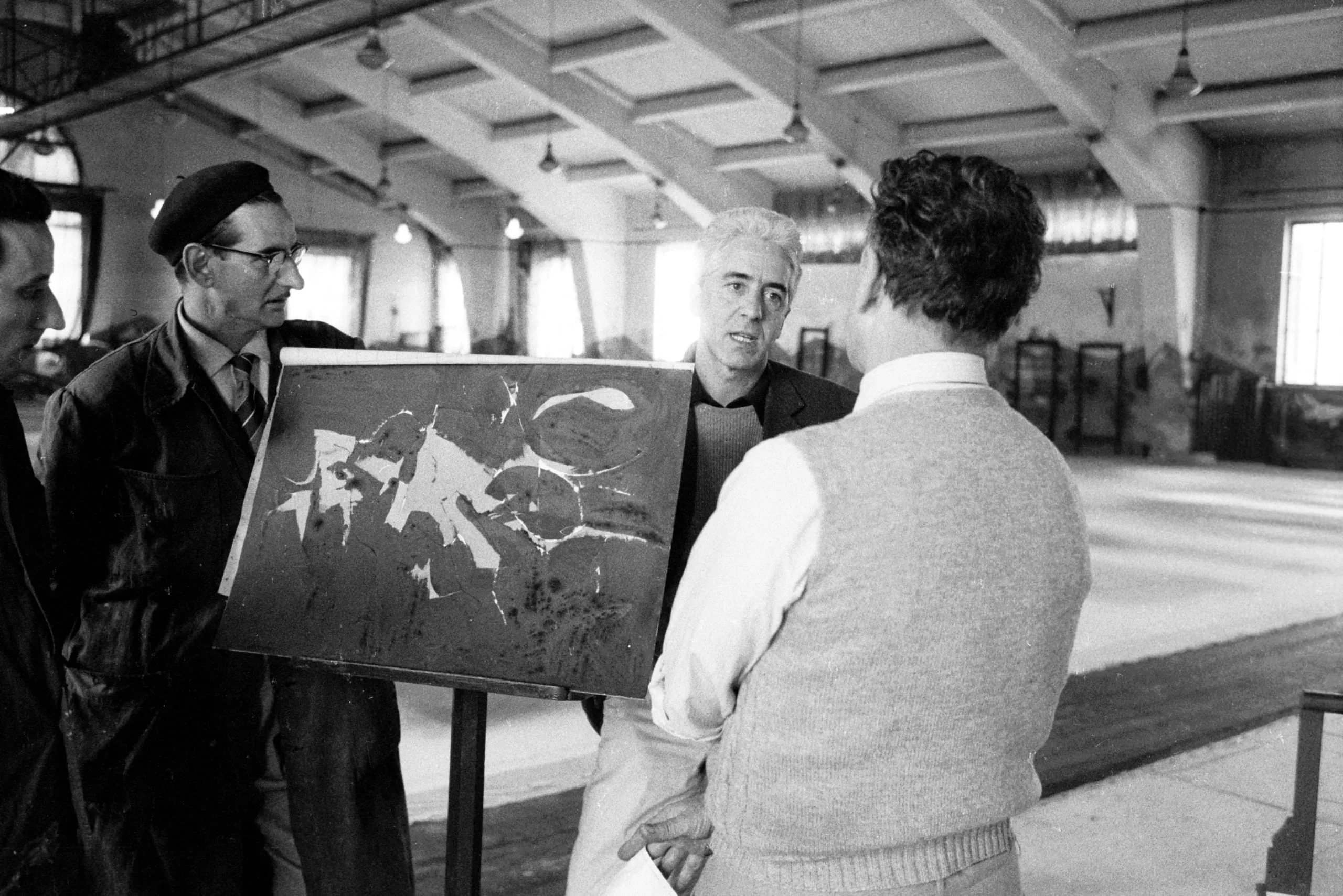 Black and white photograph of three men gathered around an abstract painting on an easel inside a large industrial space