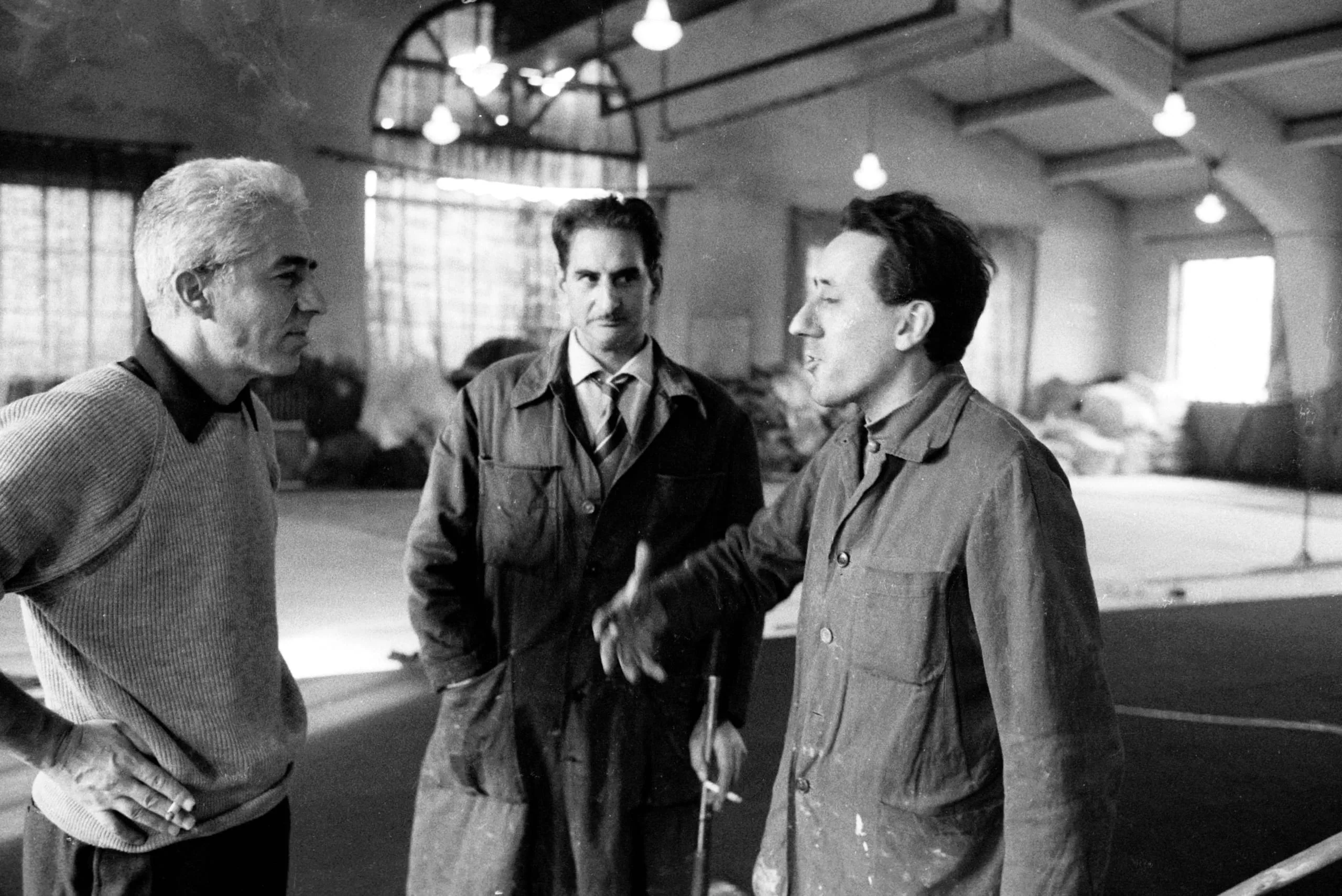 Black and white photograph of three white men in conversation inside a large industrial workspace with arched windows and bare overhead bulbs