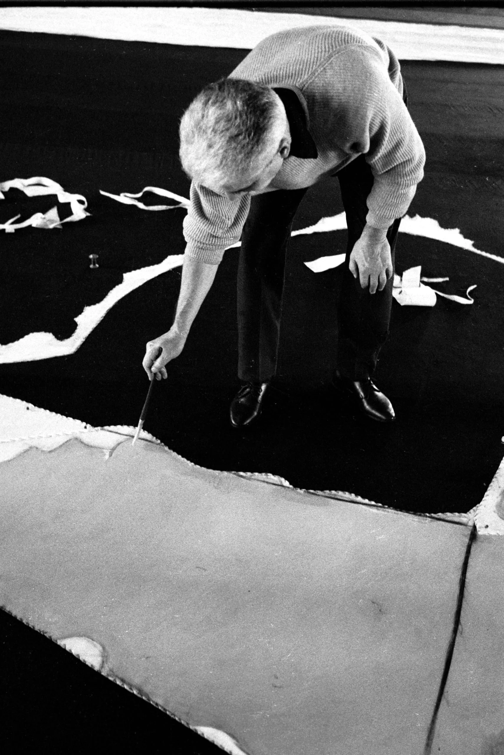 Black and white photograph, shot from above, of a man in a ribbed sweater bending over a large pale canvas on a dark floor, holding a thin tool