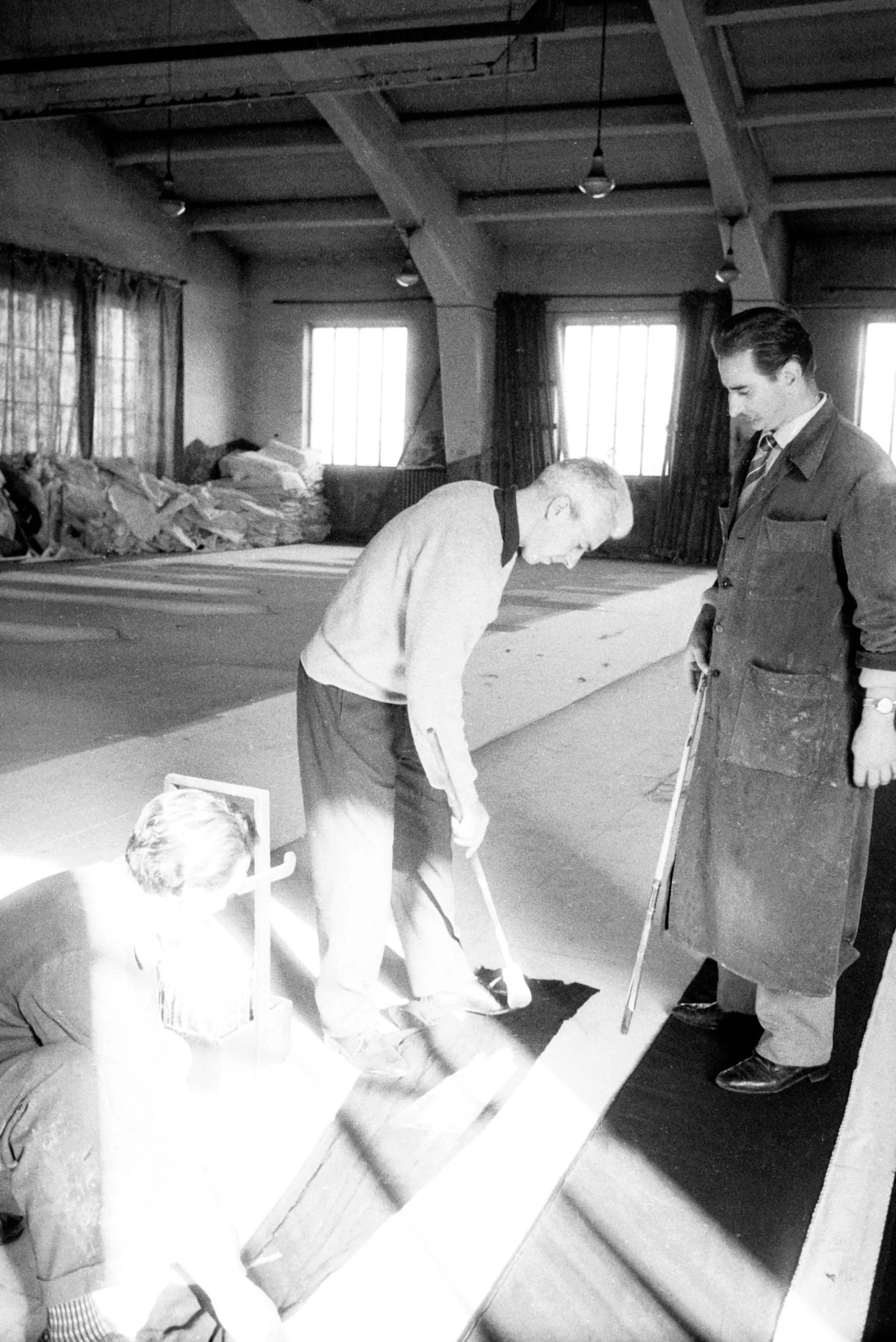 Black and white photograph of three men in a large industrial room, one bending to work on a canvas laid flat on the floor while another watches